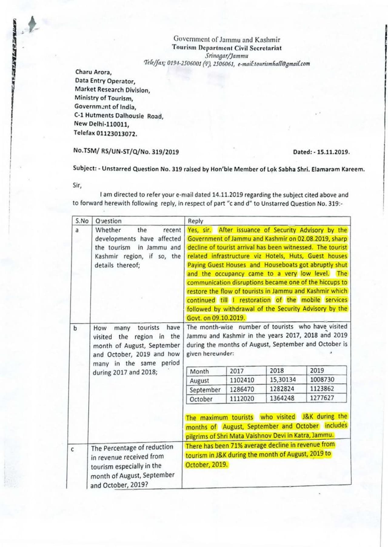 ആര്ട്ടിക്കിള് 370 റദ്ദാക്കിയത് കശ്മീരിന്റെ ടൂറിസത്തെ ബാധിച്ചിട്ടില്ലെന്ന കേന്ദ്ര ടൂറിസം മന്ത്രിയുടെ പ്രസ്താവന തെറ്റാണെന്ന് വിവരാവകാശരേഖ.