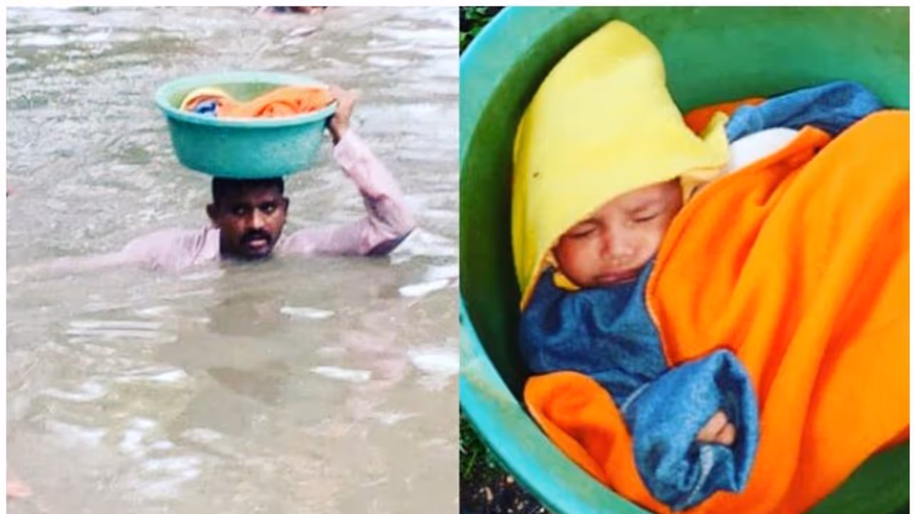 കുഞ്ഞിനെ കൈയിലെടുത്ത് വരാന് സാധിക്കുമായിരുന്നില്ല. അങ്ങനെ ഒരു പ്ലാസ്റ്റിക് പാത്രത്തില് കുഞ്ഞിനെ കിടത്തി കയറില് പിടിച്ച് ഇക്കരയെത്തിച്ചുവെന്ന് സബ് ഇന്സ്പെക്ടര് പറഞ്ഞു. പ്ലാസ്റ്റിക് പാത്രത്തില് തുണികള് വെച്ചാണ് കുഞ്ഞിനെ കിടത്തിയത്. ഏകദേശം ഒന്നര കിലോമീറ്റര് നടന്നാണ് കുഞ്ഞിനെയും അമ്മയെയും സുരക്ഷിത സ്ഥലത്തേക്ക് മാറ്റിയത്. കേരളത്തിലും പ്രളയകാലത്ത് സമാനമായ സംഭവമുണ്ടായിരുന്നു. ഇടുക്കി ഡാം തുറന്ന് ചെറുതോണി പാലത്തിന് മുകളില് വെള്ളം കയറുന്നതിന് നിമിഷങ്ങള് മുമ്പ് കുഞ്ഞിനെ ഇക്കരെയെത്തിച്ച ഉദ്യോഗസ്ഥന്റെ ധൈര്യത്തെയും ലോകം പുകഴ്ത്തിയിരുന്നു.