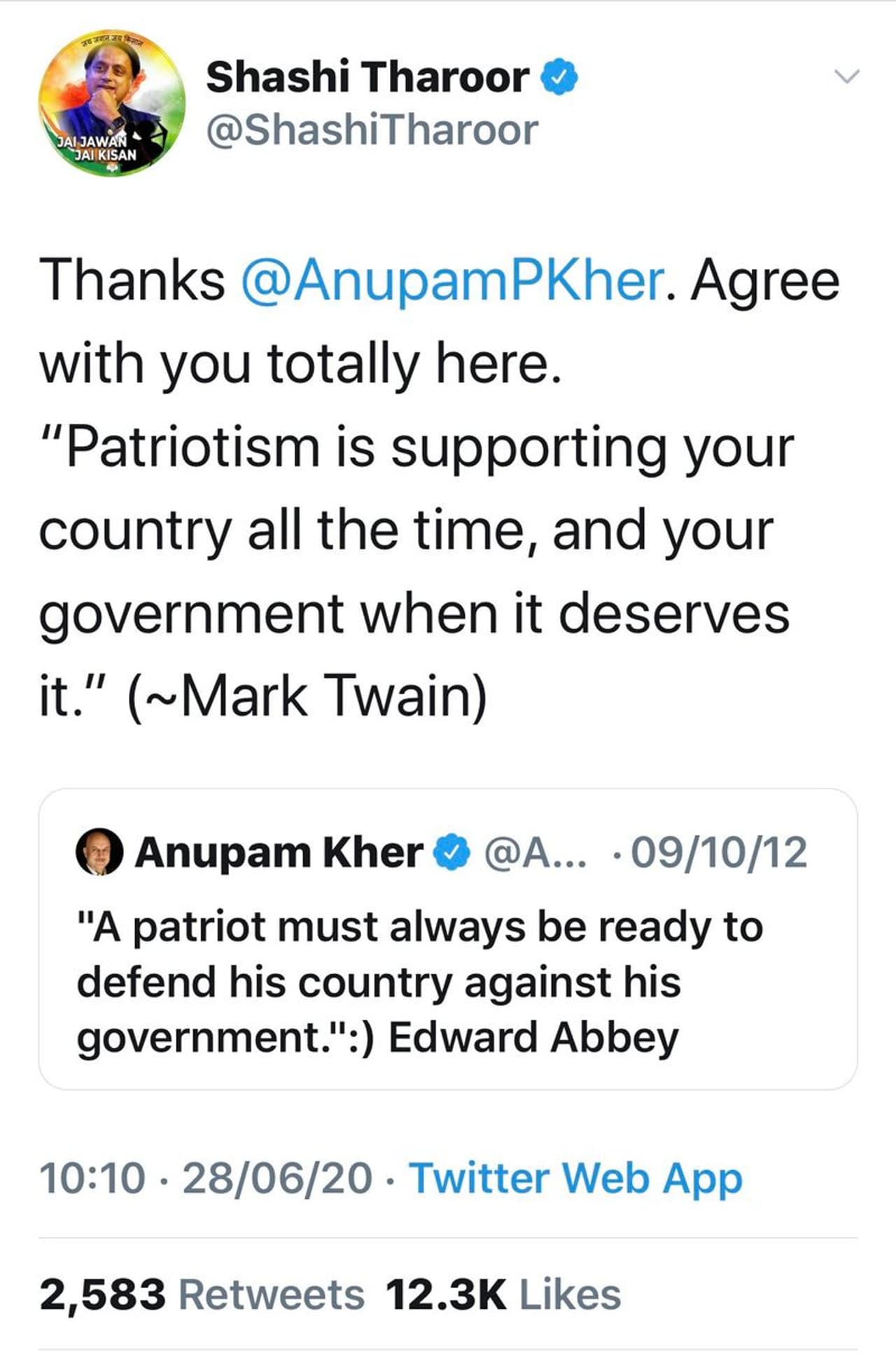 2012 ൽ അനുപം ഖേർ ചെയ്ത ഒരു ട്വീറ്റ് ഇക്കഴിഞ്ഞ ദിവസം തരൂർ റീ ട്വീറ്റ് ചെയ്തിരുന്നു. എഡ്വേർഡ് ആബിയുടെ ഒരു ക്വോട്ടായിരുന്നു അനുപം ഖേറിന്റെ ട്വീറ്റ്. "ഒരു രാജ്യസ്നേഹി എപ്പൊഴും രാജ്യത്തെ അതിന്റെ സർക്കാരിൽ നിന്ന് പ്രതിരോധിക്കാൻ സന്നദ്ധമായിരിക്കണം " എന്നായിരുന്നു അന്ന് അനുപം ഖേർ ട്വീറ്റ് ചെയ്തിരുന്നത്. അതിനോടപ്പം,"ദേശസ്നേഹം എന്നത് രാജ്യത്തെ എപ്പൊഴും സ്നേഹിക്കുകയും ഗവൺമന്റ് അർഹിക്കുമ്പോൾ മാത്രം പിന്തുണയ്ക്കുന്നതുമാണ് " എന്ന മാർക്ക് ട്വെയിന്റെ ക്വോട്ടും ചേർത്തുകൊണ്ട്, താൻ അനുപം ഖേറിനോട് തീർത്തും യോജിക്കുന്നു എന്നു പറഞ്ഞായിരുന്നു തരൂരിന്റെ ട്വീറ്റ്.