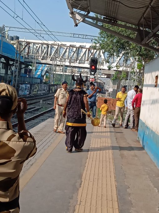 ഇത്തരം നിയമലംഘനം സ്ഥിരമായി നടക്കാറുള്ള മുംബൈയിലെ മലാഡ്, അന്ധേരി അടക്കമുള്ള തിരക്കേറിയ പല സ്റ്റേഷനുകളിലും ഇത്തരത്തില് ബോധവല്ക്കരണ പ്രവര്ത്തനങ്ങള് നടന്നു. റെയില്വേ പൊലീസുകാരനാണ് ഇത്തരത്തില് കാലന്റെ വേഷത്തിലെത്തിയത്. ഏതായാലും കാലന് നേരിട്ടെത്തിയുള്ള ബോധവല്ക്കരണത്തില് സ്ഥിരം നിയമ ലംഘകര്ക്ക് മനം മാറ്റമുണ്ടാകുമെന്ന പ്രതീക്ഷയിലാണ് റെയില്വേ.
