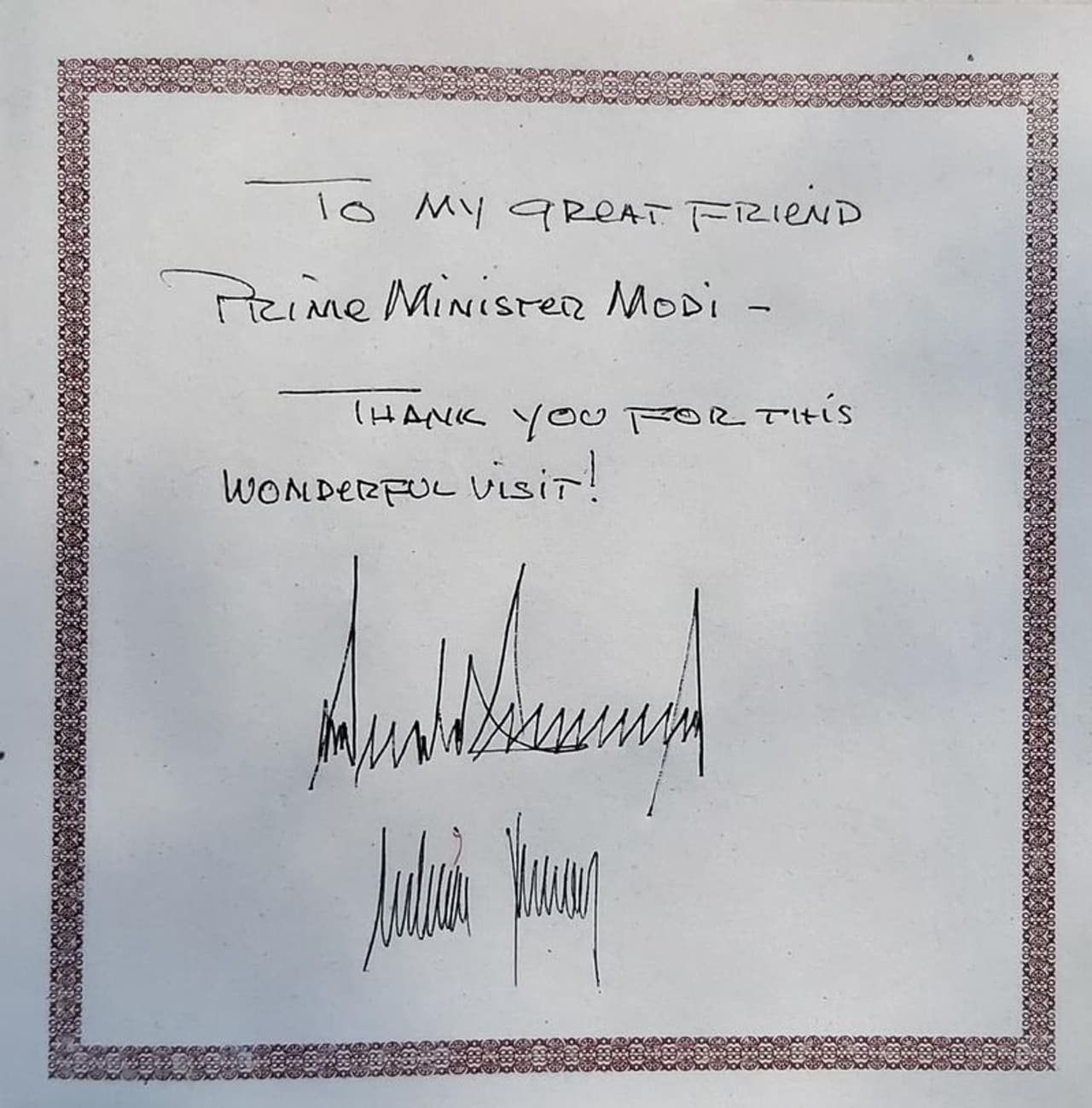 ഇതിന്റെ താഴെ തന്റെ 'സിഗ്നേച്ചർ' ഒപ്പ് തന്നെ ട്രംപ് ഇട്ടിട്ടുണ്ട്. ഒപ്പം പ്രഥമവനിത മെലാനിയയും ഒപ്പിട്ടിരിക്കുന്നത് കാണാം. ട്രംപിന്റെ ഒപ്പ് പണ്ടും പ്രശസ്തമാണ്. ട്രംപിന്റെ ഒപ്പിനെക്കുറിച്ച് ട്രോളുകൾ മുതൽ, ഇത് ആഴത്തിൽ അപഗ്രഥിച്ച്, ട്രംപിന്റെ വ്യക്തിത്വ വിശകലനം തന്നെ നടത്തിയിട്ടുണ്ടല്ലോ മനശ്ശാസ്ത്രജ്ഞർ!