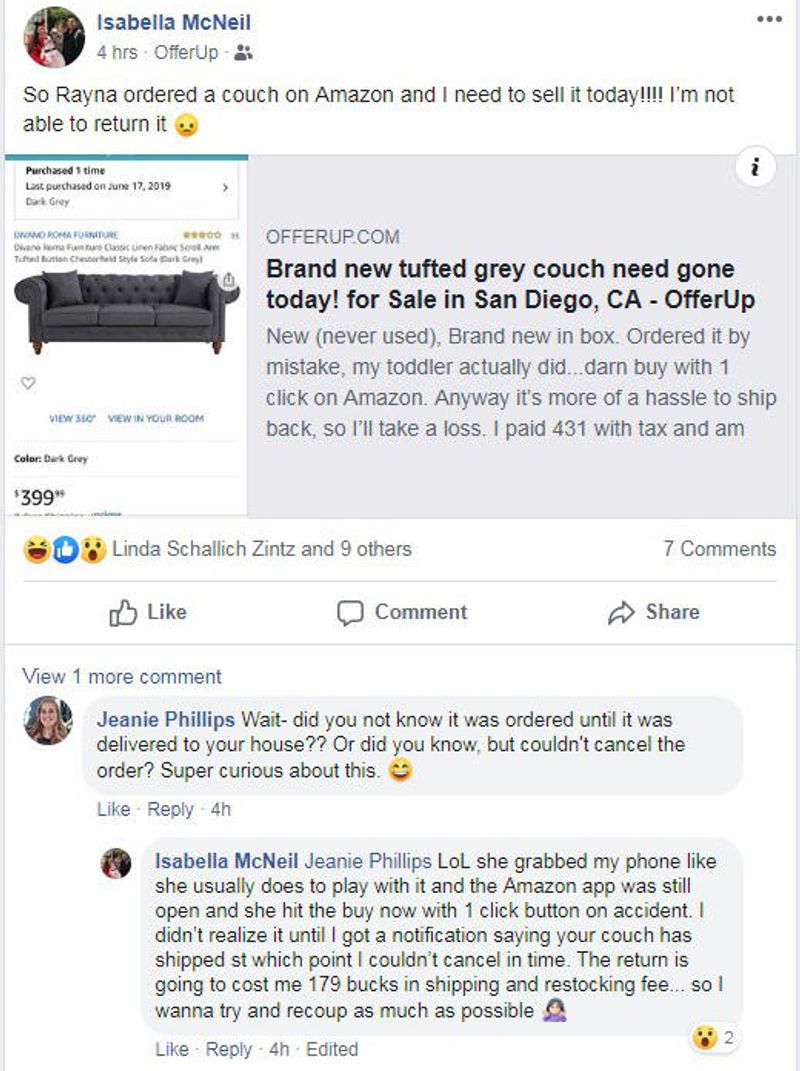തുടര്ന്ന് മറ്റൊരു വഴിയും കാണാതെ സോഫ വില്ക്കാന് യുവതി തീരുമാനിക്കുകയായിരുന്നു. മകള് അറിയാതെ ഓര്ഡര് ചെയ്ത സോഫ വില്പ്പനയ്ക്ക് എന്ന് ഫേസ്ബുക്കില് പോസ്റ്റും ചെയ്തു.