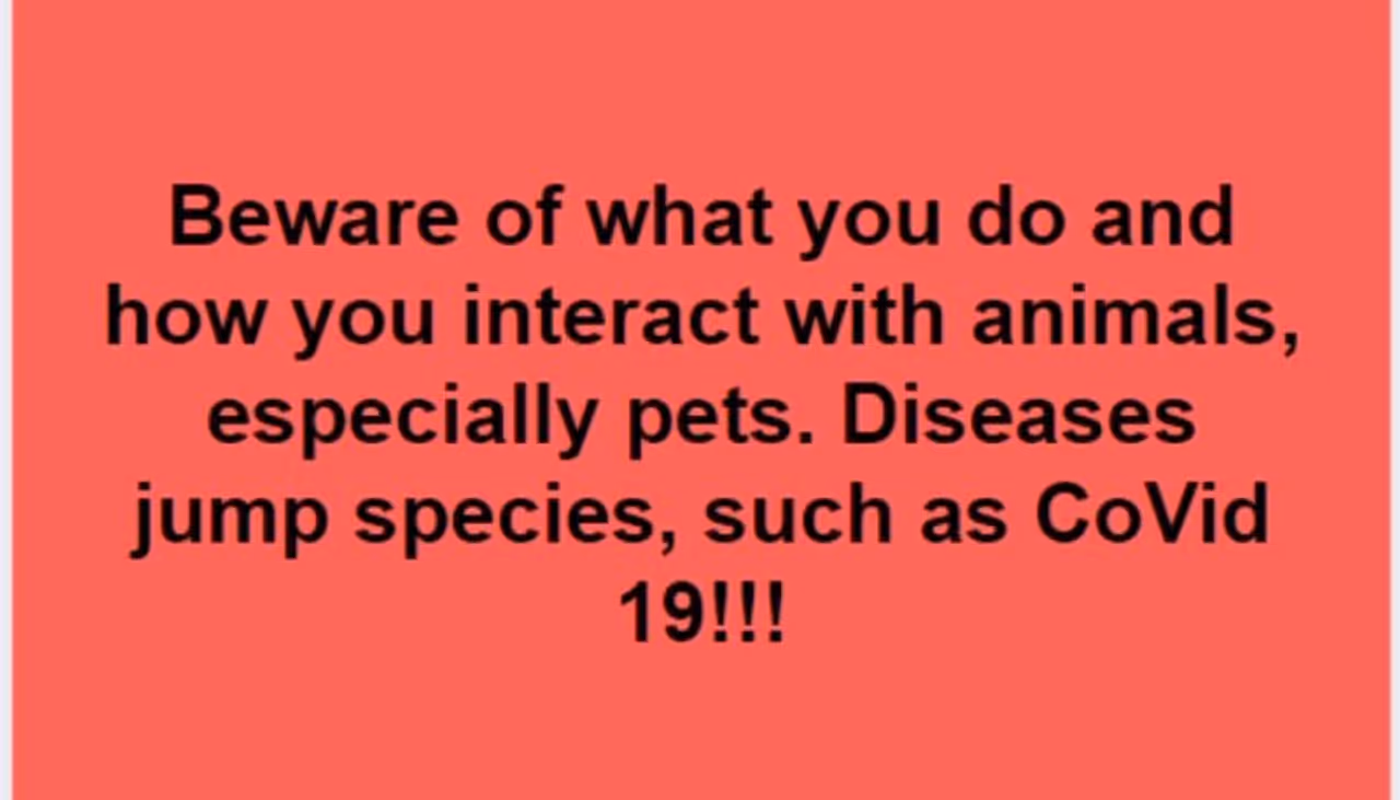 'മൃഗങ്ങളുമായി പ്രത്യേകിച്ച് വളർത്തുമൃഗങ്ങളുമായി ഇടപഴകുമ്പോള് ശ്രദ്ധിക്കുക. ഇവയില് നിന്ന് വൈറസ് മനുഷ്യരിലേക്ക് പടരും'- എന്ന പോസ്റ്റുകള് സാമൂഹ്യമാധ്യമങ്ങളില് സജീവമാണ്.
