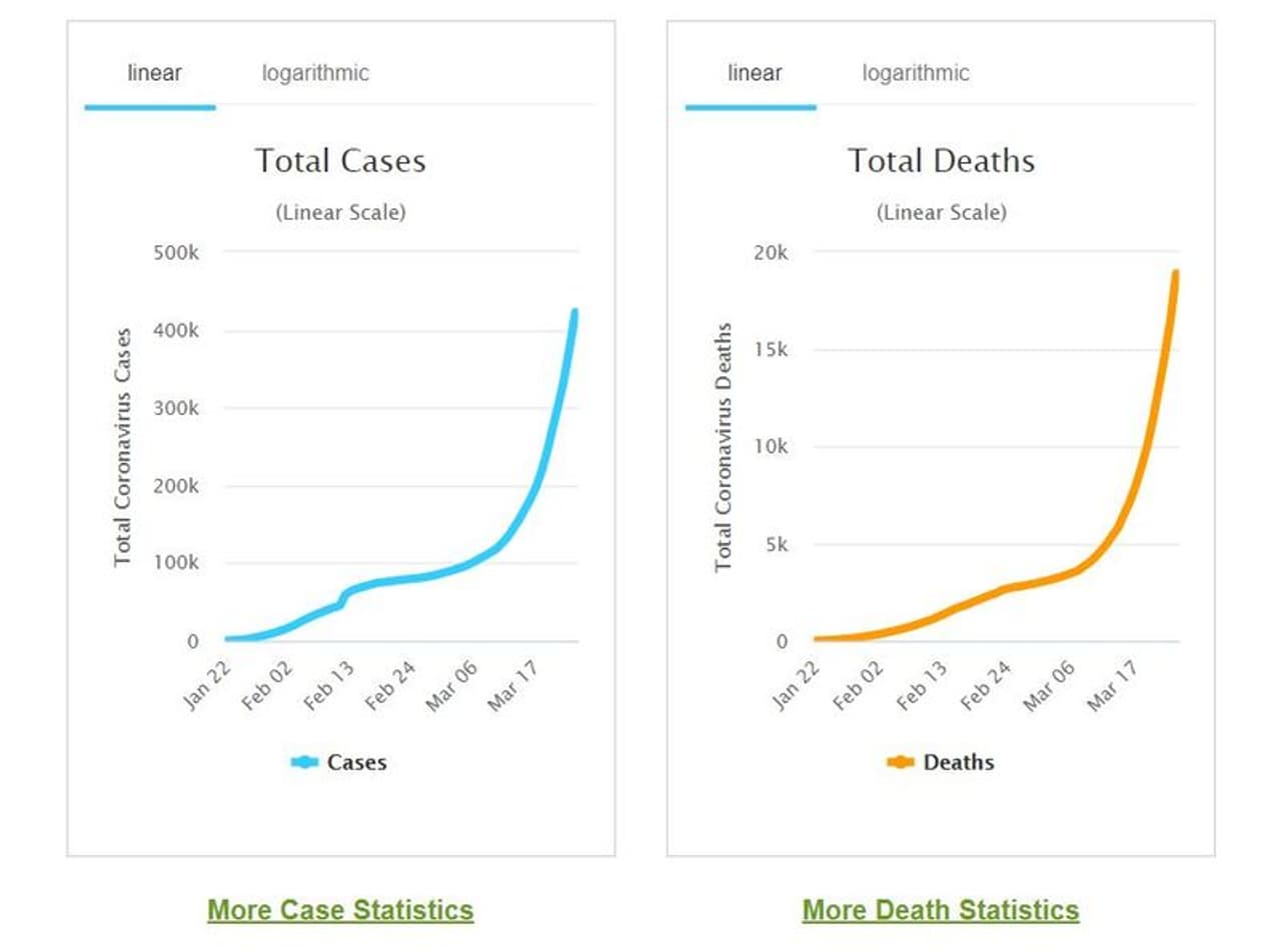 ന്യൂയോർക്ക്: ലോകത്ത് കൊവിഡ് മരണം 21,000 കടന്നു. നാല് ലക്ഷത്തി അറുപത്തിയെണ്ണായിരത്തിലേറെ പേർക്കാണ് ഇതുവരെ രോഗം ബാധിച്ചത്. ഇറ്റലിയിൽ ഇതുവരെ കൊവിഡ് മരണം 7503 ആയി. ഒറ്റ ദിവസത്തിനിടെ 683 പേരാണ് മരിച്ചത്. 5,210 പുതിയ രോഗികളുമുണ്ട്. അമേരിക്കയിൽ രോഗവ്യാപനം ദ്രുതഗതിയിലാണ്. ഒരു ദിവസത്തിനിടെ പതിനായിരത്തിലേറെ പേർ രോഗികളായി. 150-ലേറെ മരണങ്ങൾ കൂടി റിപ്പോർട്ട് ചെയ്തു.