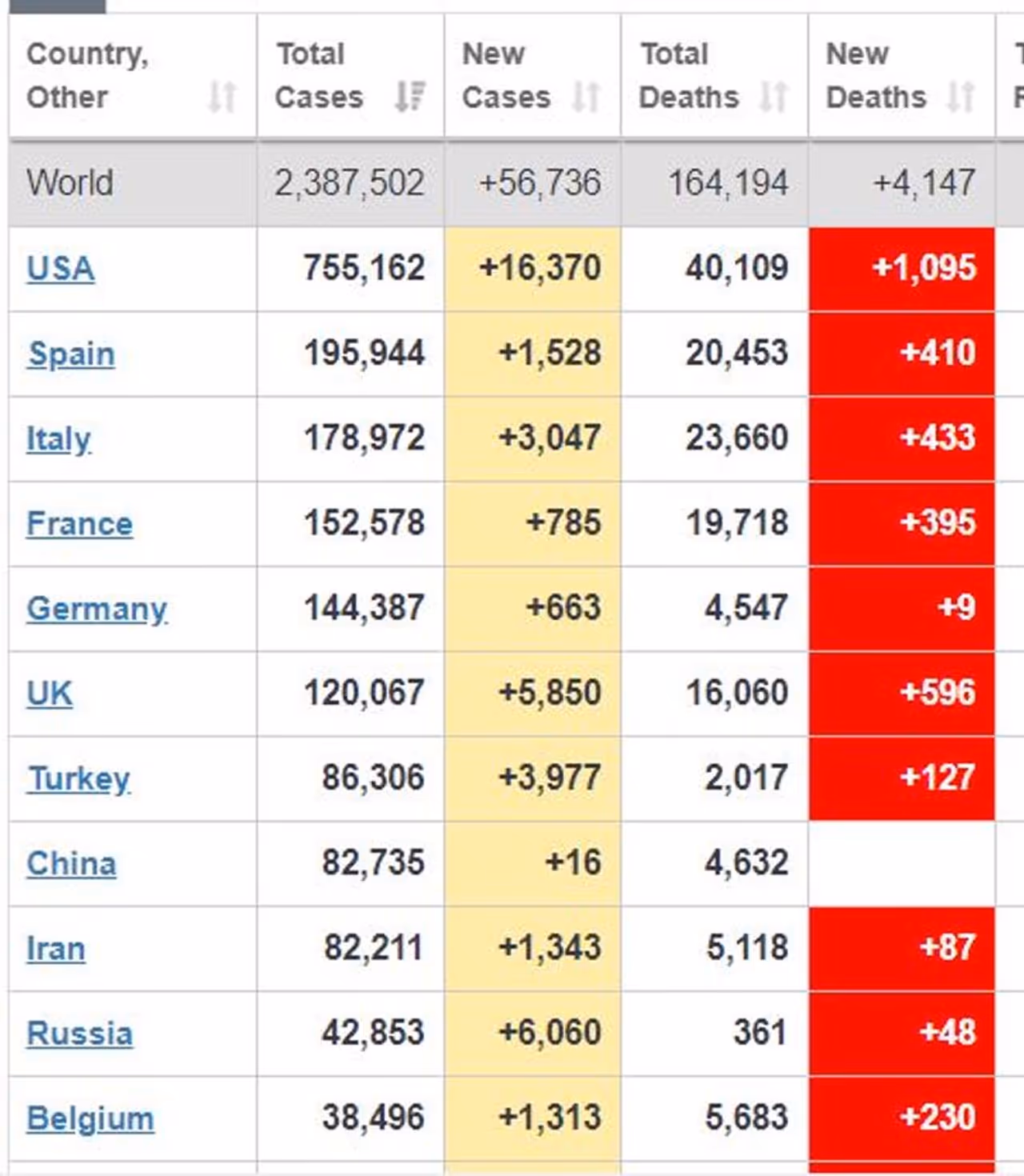 അതേസമയം ഇറ്റലിയിലാകട്ടെ ഇന്ന് 433 മരണങ്ങളാണ് 11 മണിവരെ റിപ്പോര്ട്ട് ചെയ്തിരിക്കുന്നത്. ഇവിടെ 23660 ജീവനുകളാണ് കൊവിഡ് അപഹരിച്ചത്. സ്പെയിന്, ഫ്രാന്സ്, ബെല്ജിയം എന്നിവിടങ്ങളിലും കനത്ത ആശങ്കയാണ് കൊവിഡ് വിതയ്ക്കുന്നത്. സ്പെയിനില് 410 മരണങ്ങളാണ് 24 മണിക്കൂറില് റിപ്പോര്ട്ട് ചെയ്തത്. ഇവിടുത്തെ മൊത്തം മരണസംഖ്യ 20453 ആയിട്ടുണ്ട്. ഫ്രാന്സിലാകട്ടെ ഇന്ന് 395 മരണങ്ങള് റിപ്പോര്ട്ട് ചെയ്തു. മൊത്തം മരണസംഖ്യ 19718 ആയിട്ടുണ്ട്. ബെല്ജിയത്തിലാകട്ടെ 230 മരണങ്ങളാണ് ഇന്ന് റിപ്പോര്ട്ട് ചെയ്തത്. ഇവിടുത്തെ മൊത്തം മരണസംഖ്യ 5600 പിന്നിട്ടു. തുര്ക്കിയിലും മെക്സിക്കോയിലും ഇന്ന് മാത്രം നൂറിലേറെ മരണങ്ങള് റിപ്പോര്ട്ട് ചെയ്തു.