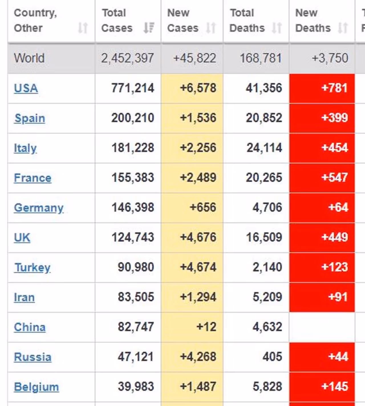 യുകെയില് മാത്രം 449 മരണങ്ങളാണ് റിപ്പോര്ട്ട് ചെയ്തിരിക്കുന്നത് ഫ്രാന്സിലാകട്ടെ 547 മരണങ്ങളാണ് റിപ്പോര്ട്ട് ചെയ്തിരിക്കുന്നത് ഇറ്റലിയിലാകട്ടെ 454 മരണങ്ങളാണ് റിപ്പോര്ട്ട് ചെയ്തിരിക്കുന്നത് സ്പെയിനില് 399 മരണങ്ങള് പുതുതായി റിപ്പോര്ട്ട് ചെയ്തു