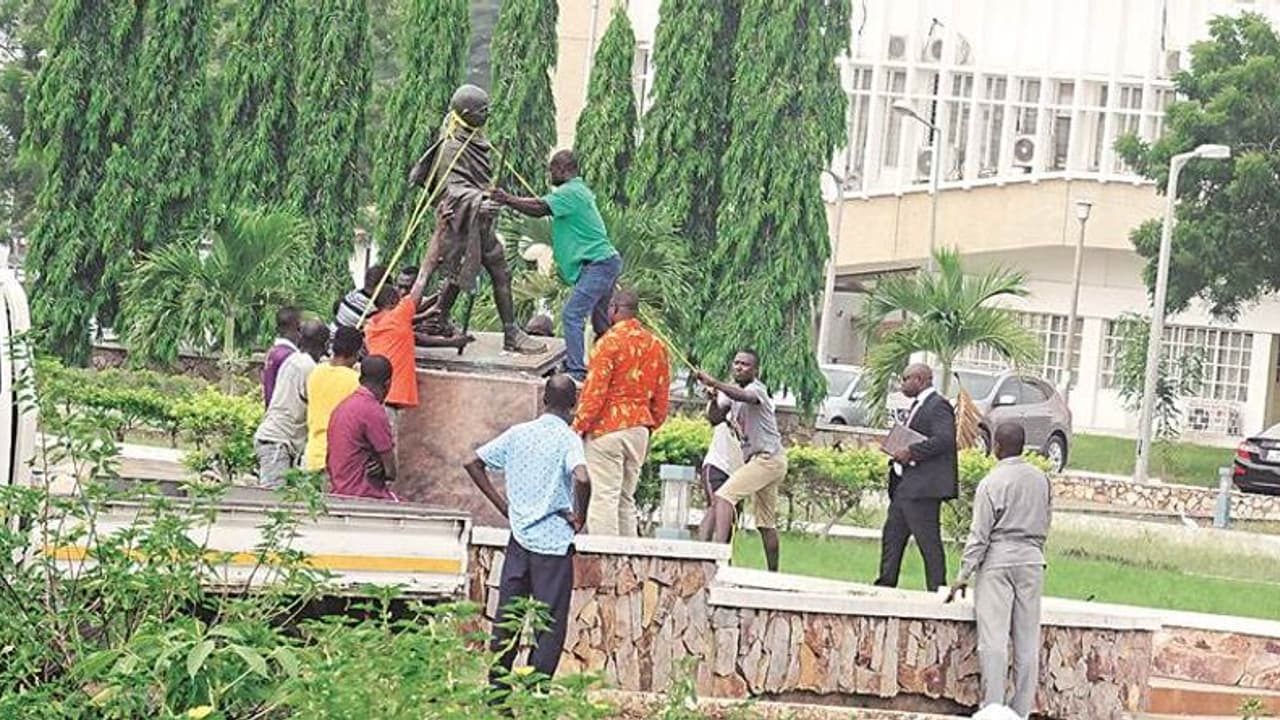 വിദ്യാര്ഥികളും അധ്യാപകരും രണ്ട് വര്ഷത്തോളം നടത്തിയ പ്രതിഷേധങ്ങള്ക്ക് ഒടുവിലാണ് ഘാന സര്വകലാശാല ഗാന്ധിപ്രതിമ നീക്കം ചെയ്തത്. 2016 സെപ്റ്റംബറില് സര്വകലാശാലയിലെ പ്രൊഫസര്മാര് 'ഗാന്ധി മസ്റ്റ് ഫോള് മൂവ്മെന്റ് ' എന്ന പേരില് പ്രതിഷേധം ആരംഭിച്ചിരുന്നു.