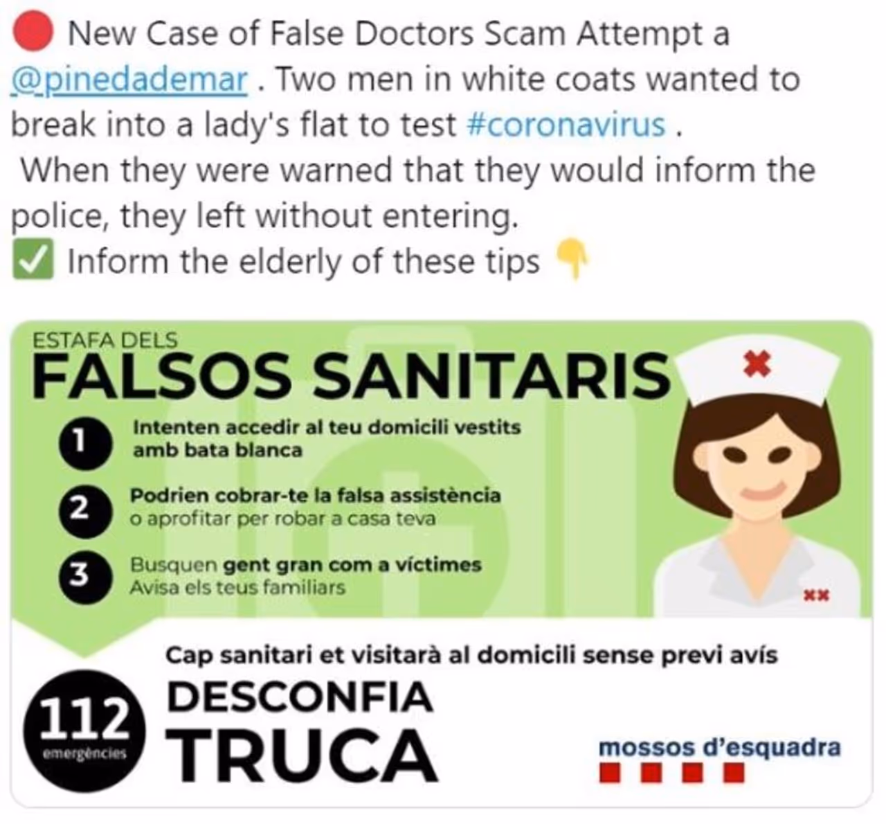 സ്വയം ഐസൊലേഷനിൽ കഴിയുന്ന ഏതൊരു രോഗിയെയും പരിശോധിക്കാൻ വേണ്ടി ആൾ വരുന്നതിനു മുമ്പ് നേരത്തെ വിളിച്ച് അപ്പോയിന്റ്മെന്റ് ഫിക്സ് ചെയ്യും എന്നും, വിളിച്ചു പറയാതെ ആരുവന്നാലും വാതിൽ തുറന്നു കൊടുക്കേണ്ടതില്ല എന്നുമാണ് സ്പാനിഷ് പോലീസിന്റെ നിർദേശം. സ്പെയിൻ ഇതുവരെ നൂറോളം പേർ കൊവിഡ് 19 ബാധിച്ചു മരിച്ചിട്ടുണ്ട്. പ്രസ്തുത സാഹചര്യത്തിൽ ജനങ്ങൾ ആശങ്കാകുലരാണ്. ഇതുമുതലെടുത്തായിരുന്നു തട്ടിപ്പു നടത്താനുള്ള ശ്രമമുണ്ടായത്.