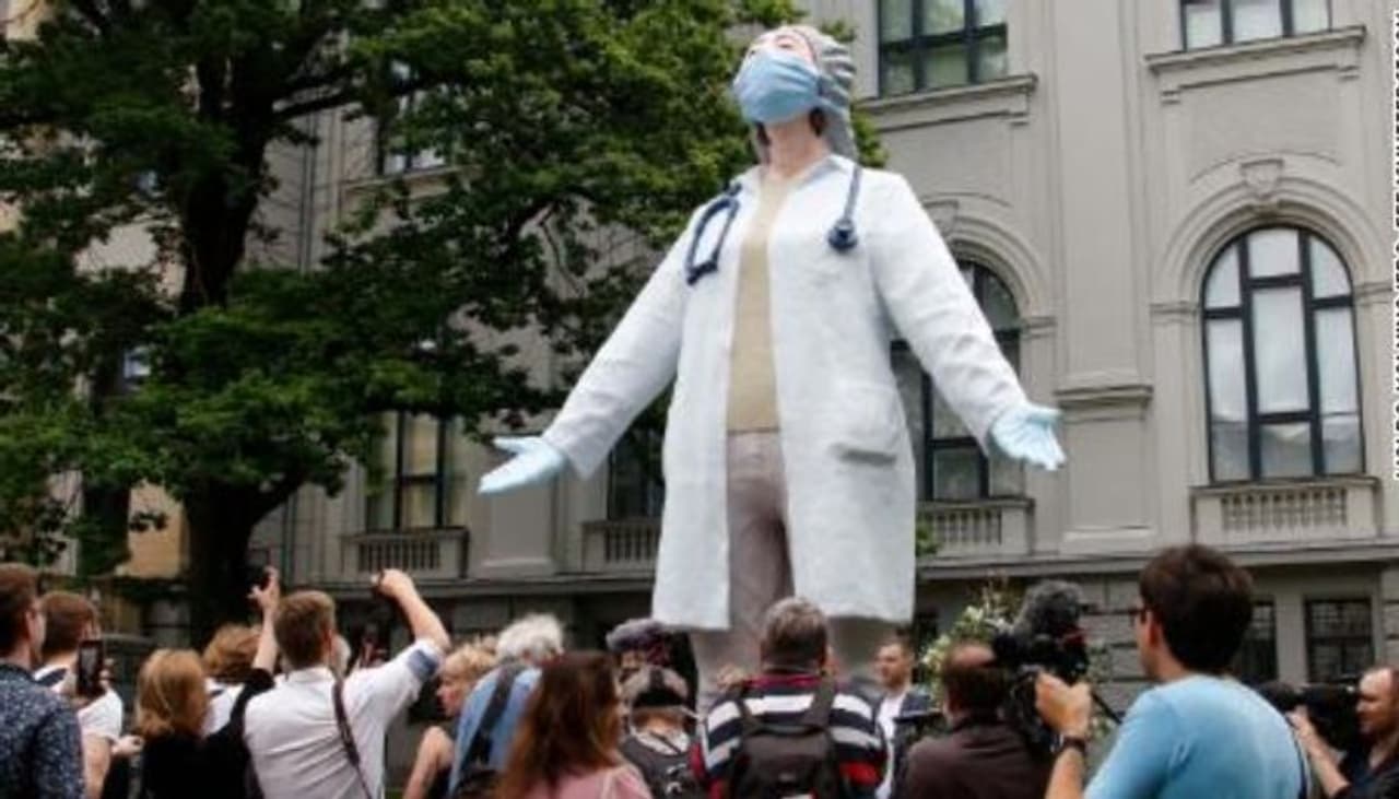 യൂറോപ്യൻ രാജ്യമായ ലാത്വിയയിലാണ് 20 അടി ഉയരത്തിലുള്ള പ്രതിമ നിർമ്മിച്ചിരിക്കുന്നത്. ലാത്വിയൻ നാഷണൽ ആർട്ട് മ്യൂസിയത്തിന് പുറത്താണ് മാസ്ക്, കൈയ്യുറ, സ്റ്റെതസ്കോപ്പ് എന്നിവ ധരിച്ച് നിൽക്കുന്ന ആരോഗ്യപ്രവർത്തകയുടെ ശില്പം ആലേഖനം ചെയ്തിരിക്കുന്നത്. ഇരുകൈകളും നീട്ടി ആകാശത്തേക്ക് നോക്കി നിൽക്കുന്ന രീതിയിലാണ് പ്രതിമയുടെ നിർമ്മാണം.