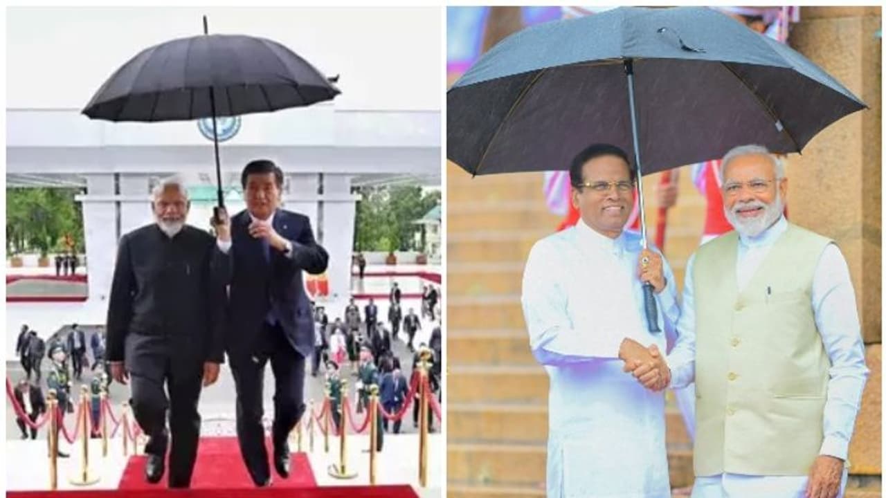 കഴിഞ്ഞ ഞായറാഴ്ച്ച മോദി ശ്രീലങ്ക സന്ദര്ശിക്കാനെത്തിയപ്പോള് പ്രസിഡന്റ് മൈത്രിപാല സിരിസേന അദ്ദേഹത്തെ കുട ചൂടിക്കുന്ന ചിത്രം ട്വിറ്ററിലൂടെയാണ് പുറത്തുവന്നത്. സിരിസേന തന്നെയാണ് ചിത്രം പങ്കുവച്ചത്. 'മഴയായാലും വെയിലായാലും താങ്കളോടൊപ്പം' എന്നാണ് ചിത്രത്തിന് വിദേശകാര്യ വക്താവ് രവീഷ് കുമാര് അന്ന് നല്കിയ കമന്റ്.