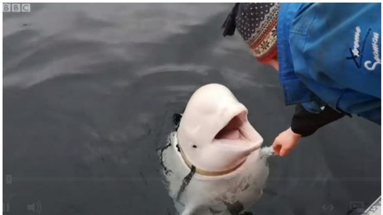 റഷ്യൻ സൈന്യത്തിൽ കുതിരകൾക്ക് ഉപയോഗിക്കുന്ന പ്രത്യേകതരം കടിഞ്ഞാൺ ധരിച്ച ബെലുഗ തിമിംഗിലമാണ് നോര്വേയുടെ പിടിയിലുള്ളത്.
