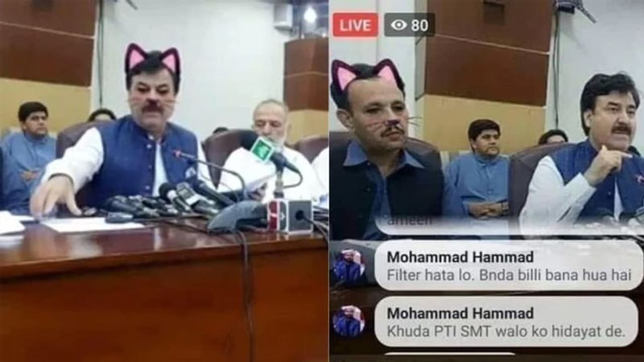 പെശവാറിൽവച്ച് നടന്ന പത്രസമ്മേളനത്തിൽ പാകിസ്താൻ തെഹ്രീഖ് ഇ ഇൻസാഫ് പാർട്ടി നേതാവായ ഷൗക്കത്ത് യൂസഫ്സായി സംസാരിക്കുന്നത് ഫേസ്ബുക്കിൽ ലൈവ് പോകുന്നതിനിടെ അദ്ദേഹത്തിന്റെ മുഖത്ത് പൂച്ചയുടെ ഫിൽറ്റർ വന്നതാണ് സോഷ്യൽമീഡിയയിൽ ചിരിപ്പരത്തിയത്.