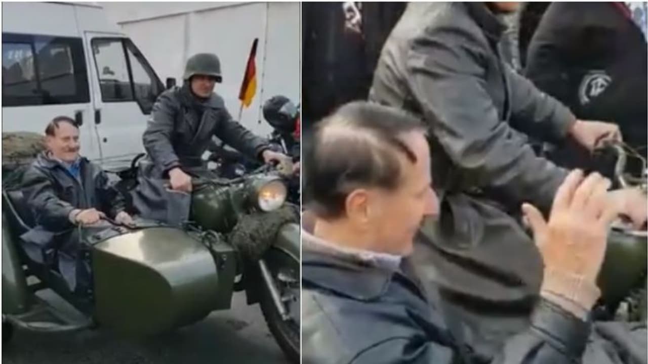 കാഴ്ചയില് ഹിറ്റ്ലറെപ്പോലെ തോന്നിക്കുന്ന ഒരാള് ഹിറ്റ്ലറുടെ വേഷം ധരിച്ച് പഴയ മോഡലിലുള്ള മോട്ടോര് സൈക്കിളില് സവാരി നടത്തിയ ദൃശ്യങ്ങളാണ് സോഷ്യല് മീഡിയയിലൂടെ പ്രചരിച്ചത്. ഹിറ്റ്ലറുടെ കുപ്രസിദ്ധമായ മുറിമീശയും കോട്ടും ഹെയര്സ്റ്റൈലുമെല്ലാം അതേപോലെ തന്നെ പകര്ത്തിയായിരുന്നു അപരനെത്തിയത്. രണ്ടാം ലോകമഹായുദ്ധ കാലത്തെ നാസി സൈനികന്റെ യൂണിഫോം ധരിച്ച ഒരാളാണ് മോട്ടോര്സൈക്കിള് ഓടിച്ചിരുന്നത്. പ്രത്യേക ഇരിപ്പിടമുള്ള മോട്ടോര് സൈക്കിളിലിരുന്ന ഇയാള് ഹിറ്റ്ലറെപ്പോലെ തന്നെ കാണികളെ അഭിവാദ്യം ചെയ്യുന്നുണ്ടായിരുന്നു.