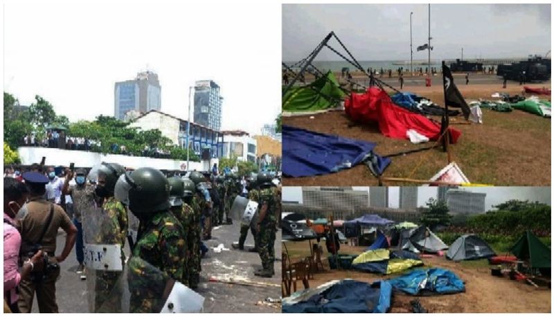 കൊളംബോയിൽ മഹിന്ദയുടെ ഔദ്യോഗിക വസതിയായ ടെംപിൾ ട്രീസിന് സമീപമായിരുന്നു പ്രധാനമന്ത്രിയുടെ രാജി ആവശ്യപ്പെട്ടുള്ള പ്രതിഷേധം. ടെന്റ് അടിച്ച് ഒത്തുകൂടിയ പ്രതിഷേധക്കാർ, സമരവേദിയായ മൈനഗോഗാമയ്ക്ക് മുന്നിലാണ് കയ്യേറ്റം ചെയ്യപ്പെട്ടത്. ആക്രമണത്തിൽ നാൽപ്പതോളം പേർക്ക് പരിക്കേറ്റു. പ്രതിപക്ഷ നേതാവിന് നേരെയും ആക്രമണം ഉണ്ടായി. ടെന്റുകളെല്ലാം ജനക്കൂട്ടം തകർത്തു. ഇവരെ തുരത്താൻ പൊലീസ് ജലപീരങ്കിയും പ്രയോഗിച്ചു. പൊലീസ് തീർത്ത ബാരിക്കേഡ് മറികടന്നെത്തിയാണ് മഹിന്ദ അനുകൂലികൾ പ്രതിഷേധക്കാരെ ആക്രമിച്ചത്. വടികളുമായി എത്തിയ സർക്കാർ അനുകൂലികൾ നിരായുധരായ പ്രതിഷേധക്കാരെ തല്ലി ഓടിക്കുകയായിരുന്നു. പൊലീസിന് കാഴ്ചക്കാരാകേണ്ടി വന്നു. പിന്നീട് കലാപത്തെ നേരിടാൻ പരിശീലനം ലഭിച്ച പ്രത്യേക സേന രംഗത്തിറങ്ങിയാണ് സ്ഥിതിഗതികൾ ശാന്തമാക്കിയത്. തൊട്ടുപിന്നാലെ കൊളംബോയിൽ കർഫ്യൂ പ്രഖ്യാപിച്ചു. ഇത് പിന്നീട് രാജ്യത്ത് എല്ലായിടത്തും ബാധകമാക്കി. മഹിന്ദ പ്രധാനമന്ത്രി പദം ഒഴിഞ്ഞേക്കുമെന്ന റിപ്പോർട്ടുകൾക്കിടെയായിരുന്നു ഈ ആക്രമണം. ആക്രമണത്തെ പ്രസിഡന്റ് തള്ളിപ്പറഞ്ഞതോടെയാണ് പിടിവള്ളി നഷ്ടപ്പെട്ട് മഹിന്ദയ്ക്ക് രാജിവയ്ക്കേണ്ടി വന്നത്.