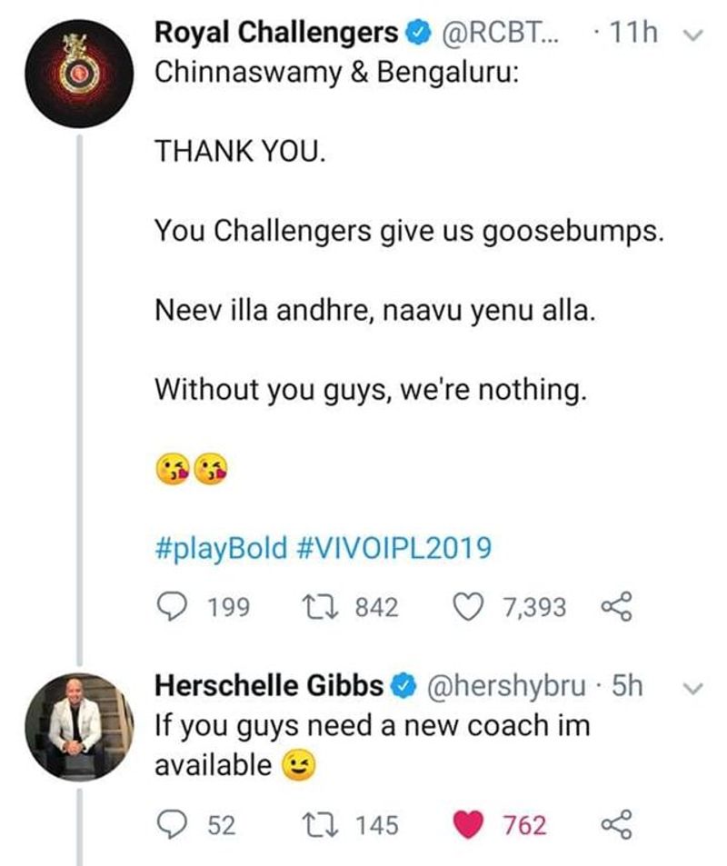 ഇതിനിടെ ആര്സിബിയുടെ പരിശീലകനാവാന് തയ്യറാണെന്ന് അറിയിച്ചുക്കൊണ്ട് രംഗത്തെത്തിയിരിക്കുകയാണ് മറ്റൊരു ദക്ഷിണാഫ്രിക്കകാരന്. മുന് ദക്ഷിണാഫ്രിക്കന് താരം ഹെര്ഷലെ ഗിബ്സാണ് തന്റെ ആഗ്രഹം ട്വിറ്ററിലൂടെ അറിയിച്ചത്. എന്നാല് ഇക്കാര്യം ടീം മാനേജ്മെന്റ് എത്രത്തോളം ഗൗരവത്തിലെടുത്തിട്ടുണ്ടെന്ന് അറിവായിട്ടില്ല.