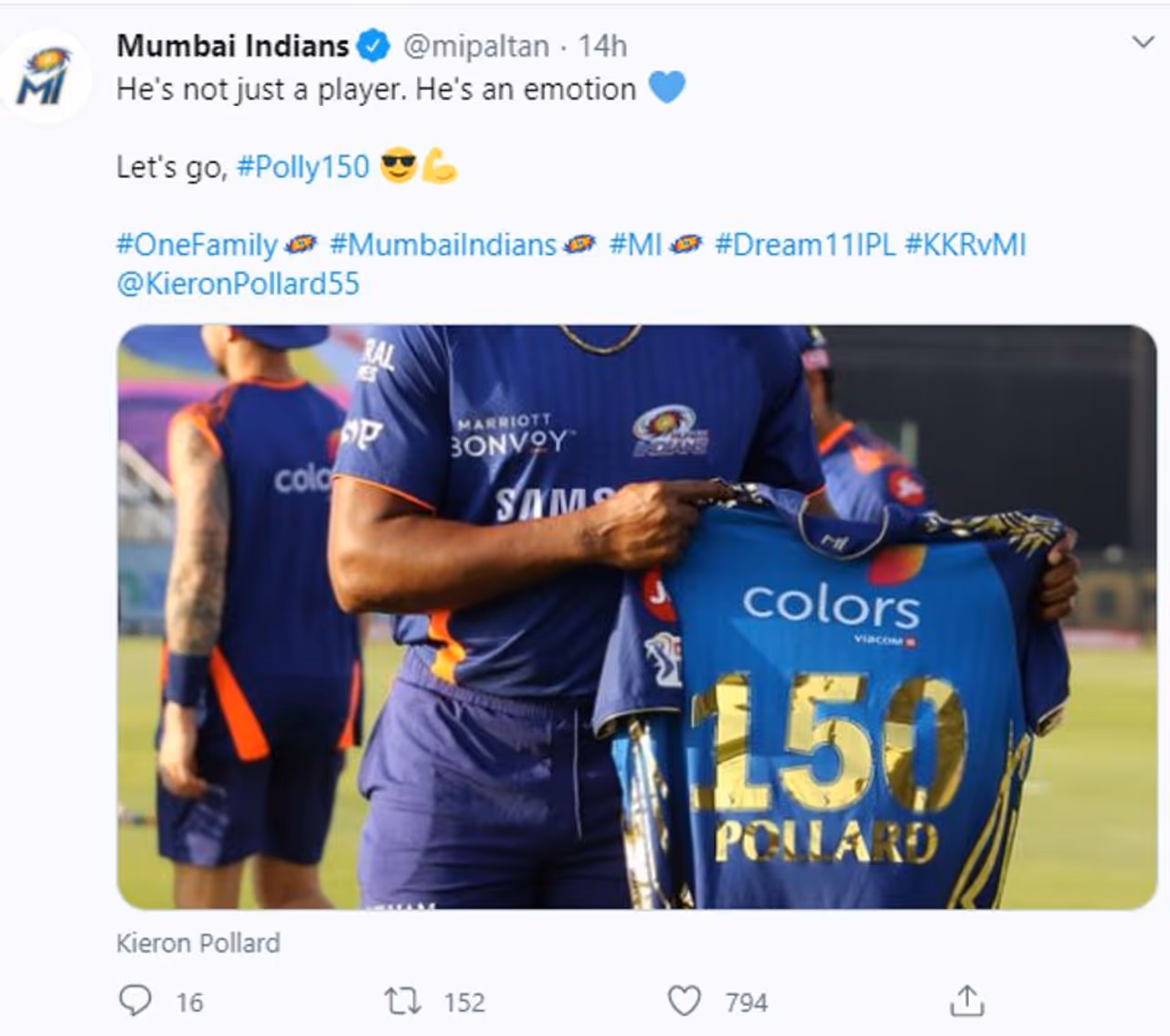 പൊള്ളാര്ഡ് മുംബൈ ഇന്ത്യന്സിന് ഒരു താരം മാത്രമല്ല, വികാരമാണ് എന്ന കുറിപ്പോടെ ടീം ഇതിന്റെ ചിത്രം ട്വീറ്റ് ചെയ്തു.