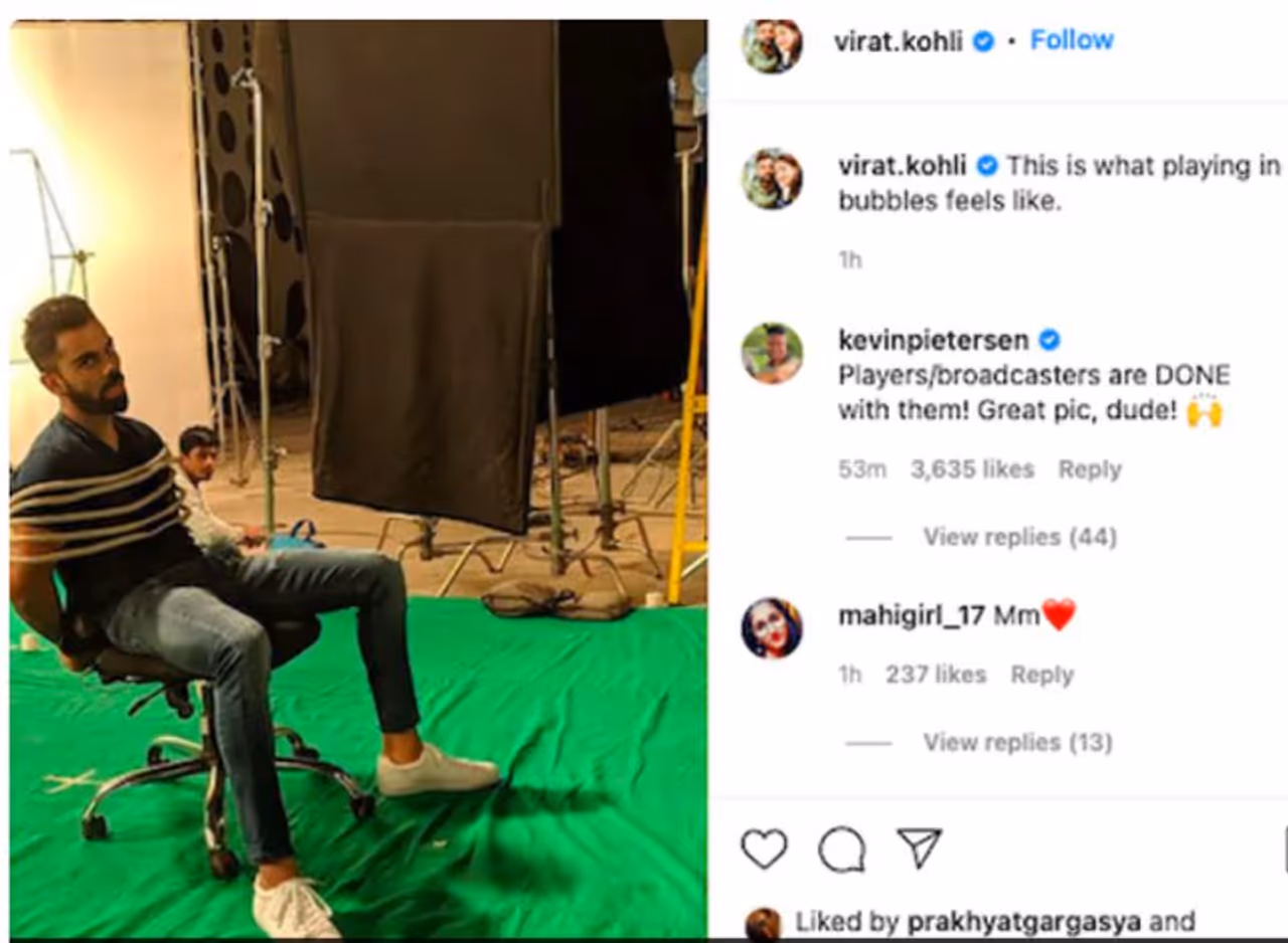 തന്റെ ശരീരവും കൈകളും കസേരയ്ക്ക് പിന്നില് കെട്ടിയിരിക്കുന്നതാണ് കോലിയുടെ ചിത്രം. 'ഇങ്ങനെയിരിക്കും ബയോ-ബബിള്' എന്ന അടിക്കുറിപ്പോടെയാണ് കോലിയുടെ ചിത്രം. പരസ്യ ഷൂട്ടിംഗിന് ഇടയിലോ മറ്റോ എടുത്ത ചിത്രമാണിത്. ചിത്രത്തിന് താഴെയുള്ള കമന്റുകള് കൊഴുപ്പിച്ച് ഇംഗ്ലീഷ് മുന്താരവും കമന്റേറ്ററുമായ കെവിന് പീറ്റേര്സണെത്തി. 'താരങ്ങളും ബ്രോഡ്കാസ്റ്റര്മാരും സമാന അവസ്ഥയിലാണ്! ഗംഭീര ചിത്രം' എന്നായിരുന്നു കെപിയുടെ കമന്റ്.