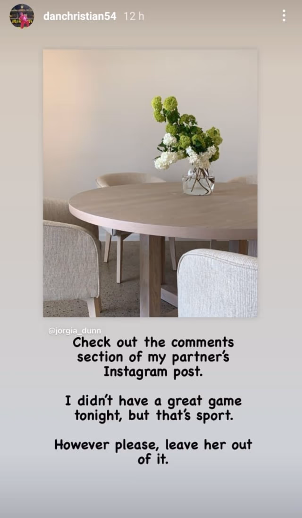 അതിന്റെ നീരസം അദ്ദേഹം ഇന്സ്റ്റഗ്രാം സ്റ്റോറിയില് വ്യക്തമാക്കുകയും ചെയ്തു. ക്രിസ്റ്റിയന്റെ വാക്കുകളിങ്ങനെ... ''എന്റെ പങ്കാളിയുടെ ഇന്സ്റ്റഗ്രാം പോസ്റ്റുകളുടെ കമന്റ് സെക്ഷന് നോക്കൂ. ശരിയാണ് ഇന്ന് എനിക്ക് നല്ല ദിവസമായിരുന്നില്ല. സ്പോര്ട്സില് അങ്ങനെയാണ്. എന്നാല് എന്റെ ഭാര്യയെ വെറുതെ വിടൂ.'' അദ്ദേഹം കുറിച്ചിട്ടു.