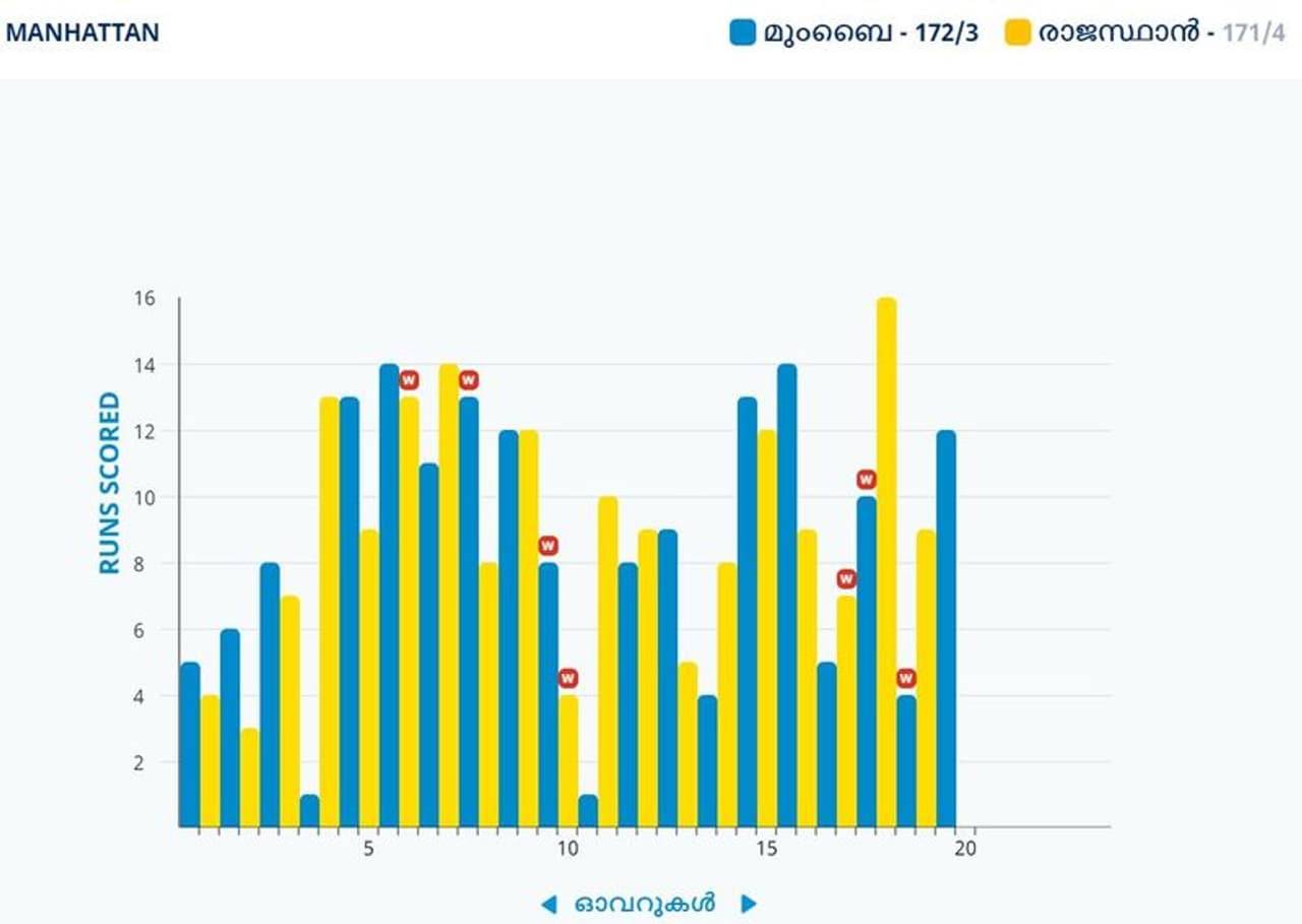 നേരത്തെ നാല് വിക്കറ്റ് നഷ്ടത്തിലാണ് രാജസ്ഥാന് 171 റണ്സെടുത്തത്. 42 റണ്സെടുത്ത ക്യാപ്റ്റന് സഞ്ജു സാംസണാണ് രാജസ്ഥാന്റെ ടോപ് സ്കോറര്. ബട്ലര്(41), ശിവം ദുബെ(35), യശസ്വി ജയ്സ്വാള്(32) എന്നിവരും രാജസ്ഥാനായി തിളങ്ങി. മുംബൈക്കായി രാഹുല് ചാഹര് 33 റണ്സ് വഴങ്ങി രണ്ട് വിക്കറ്റെടുത്തു. ഡേവിഡ് മില്ലര് (7), റിയാന് പരാഗ് (8) പുറത്താവാതെ നിന്നു. രാഹുല് ചാഹര് മുംബൈയ്ക്കായി രണ്ട് വിക്കറ്റെടുത്തു. ജസ്പ്രീത് ബുമ്ര, ജസ്പ്രീത് ബുമ്ര എന്നിവര് ഓരോ വിക്കറ്റ് വീഴ്ത്തി.
