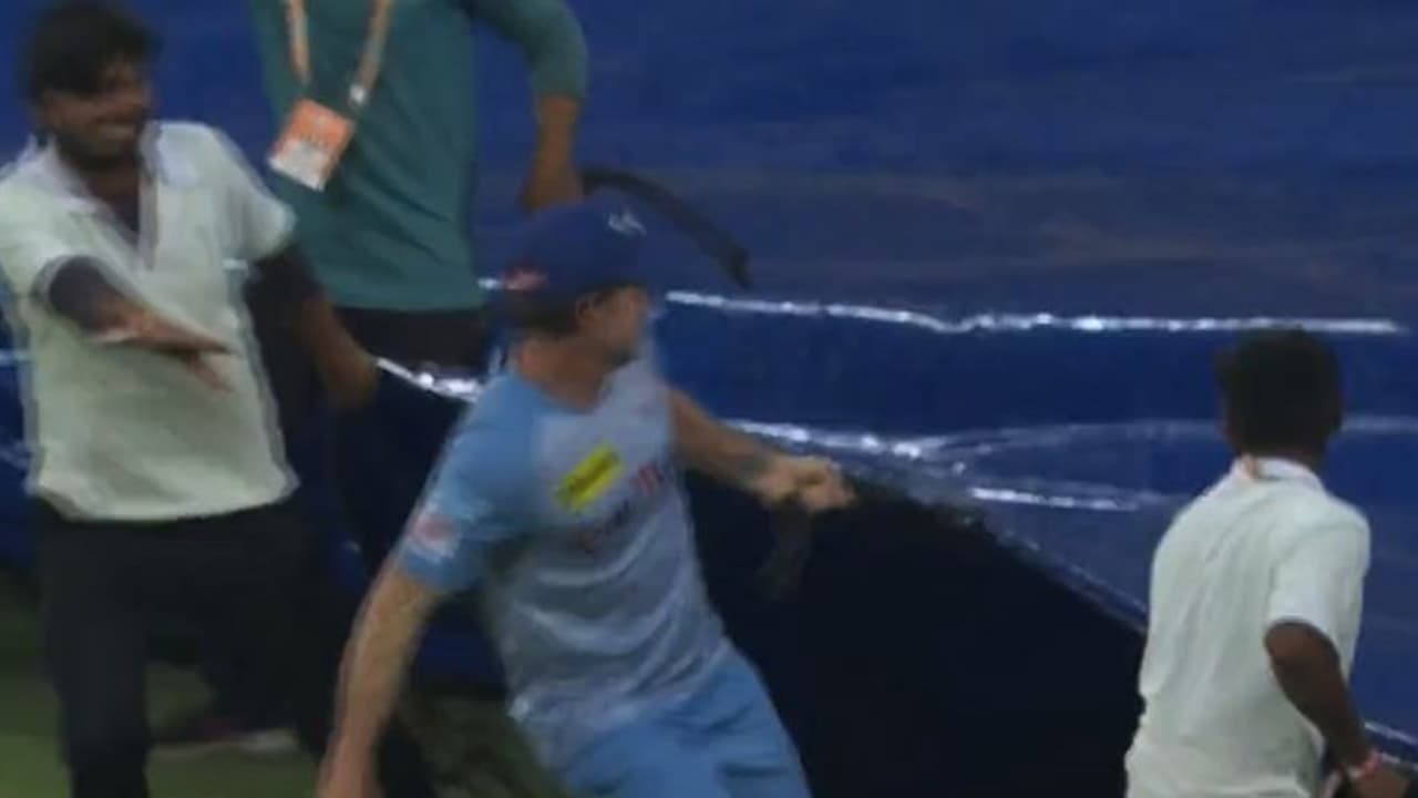 മത്സരത്തിനിടെ മഴ വന്നപ്പോള് ഗ്രൗണ്ട് സ്റ്റാഫുകള്ക്കൊപ്പം പിച്ച് മൂടാനുള്ള പരിശ്രമത്തില് ഏര്പ്പെടുകയായിരുന്നു താരം