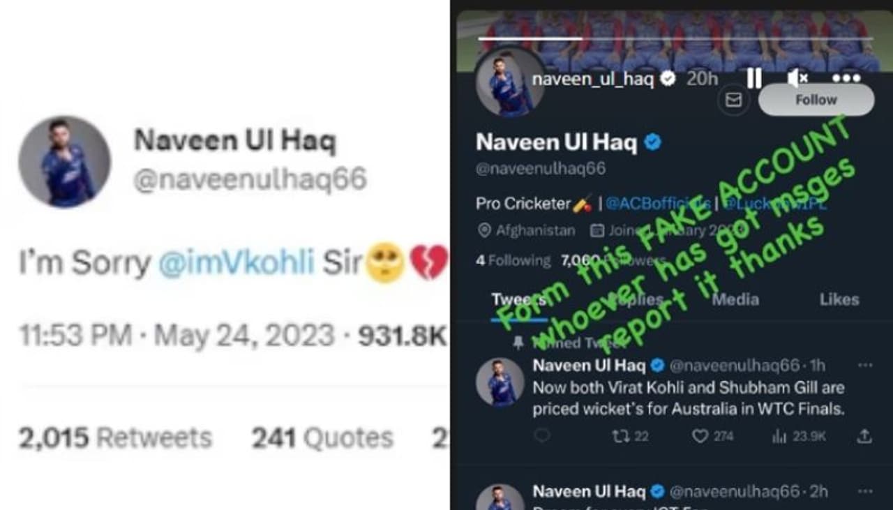 ഇതിന് പിന്നാലെ നവിന് ഉള് ഹഖിന്റെ ചിത്രവും വെരിഫൈഡ് അക്കൗണ്ടുകള്ക്ക് നല്കാറുള്ള നീല ടിക്കുമുള്ള മറ്റൊരു ട്വിറ്റര് അക്കൗണ്ടില് നിന്ന് ലോക ടെസ്റ്റ് ചാമ്പ്യന്ഷിപ്പ് ഫൈനലില് ശുഭ്മാന് ഗില്ലിന്റെയും വിരാട് കോലിയുടെയും വിക്കറ്റുകളാണ് ഓസ്ട്രേലിയക്ക് നിര്ണായകമാകുക എന്ന് ട്വീറ്റ് എത്തി. അതിന് മുമ്പ് വരാനിരിക്കുന്ന ഏകദിന ലോകകപ്പില് വിരാട് കോലി ടോപ് സ്കോററാകുകയും രോഹിത് കിരീടം നേടുകയും ധോണി ഇന്ത്യയുടെ മുഖ്യപരിശീലകനായി എത്തുകയും ചെയ്യുക എന്നത് ആരാധകന് എന്ന നിലയില് വലിയ സ്വപ്നമാണെന്നും ട്വീറ്റ് ചെയ്തിരുന്നു.