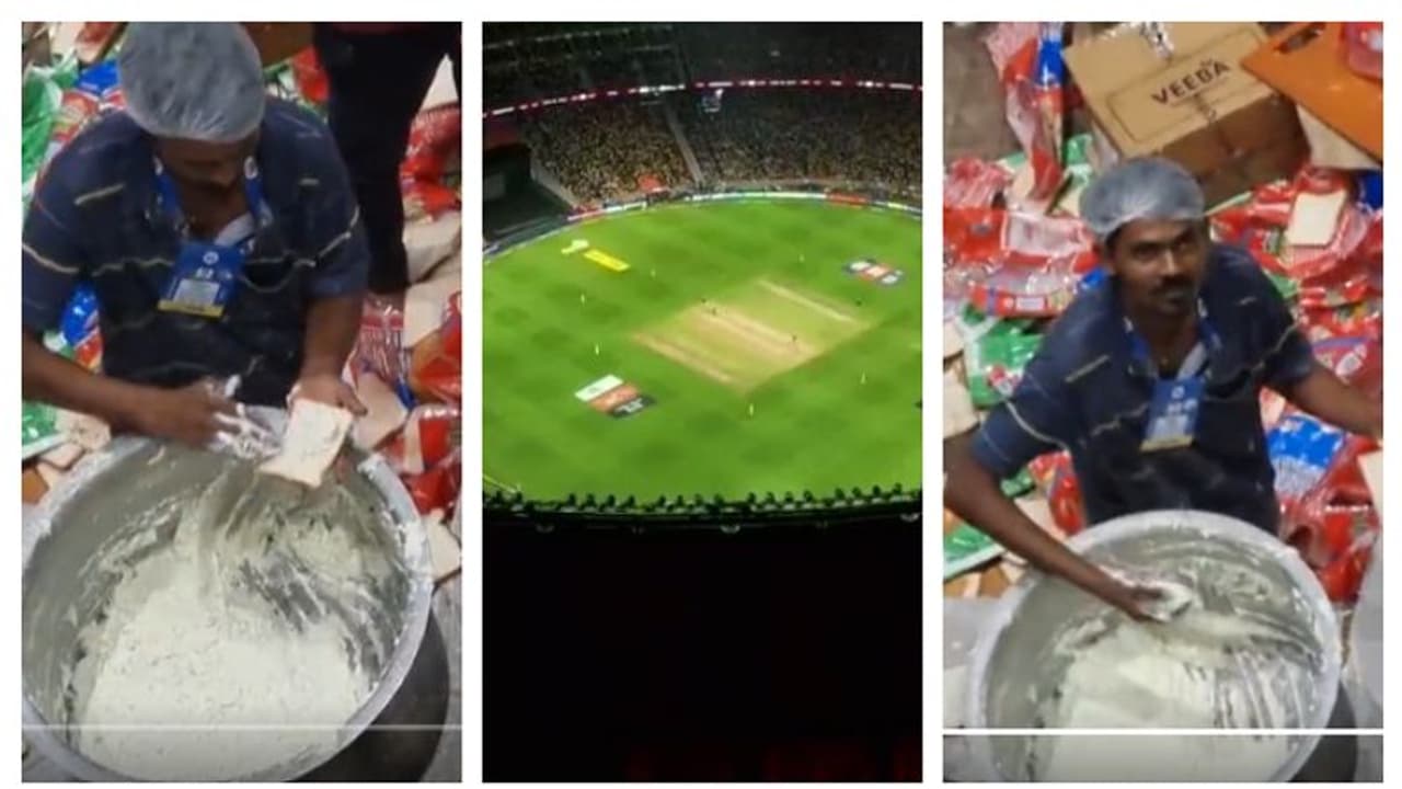 സ്റ്റേഡിത്തില് നിന്നുള്ള മറ്റൊരു വീഡിയോയാണ് സോഷ്യല് മീഡിയയില് ചര്ച്ചയാകുന്നത്. മത്സരം കാണാനെത്തിയവര്ക്ക് കഴിക്കാന് നല്കിയ സാന്വിച്ചാണ് പ്രശ്നം. വൃത്തിഹീനമായ സാഹചര്യത്തിലാണ് സാന്വിച്ച് തയ്യാറാക്കുന്നത്.