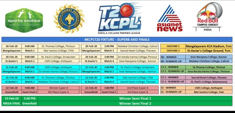 ഏഷ്യാനെറ്റ് ന്യൂസും സ്പോർട്സ് എക്സോട്ടിക്കയും ചേർന്ന് കേരള ക്രിക്കറ്റ് അസോസിയേഷന്റെ ആഭിമുഖ്യത്തിൽ നടത്തുന്ന കേരള കോളേജ് പ്രീമിയർ ലീഗിന്റെ സൂപ്പർ 8 ലീഗ് മത്സങ്ങൾക്ക് തുടക്കമായി. ഇന്നും നാളെയുമായി നടക്കുന്ന മത്സരങ്ങളിൽ വിജയിക്കുന്ന ടീമുകൾ തമ്മിൽ ശനിയാഴ്ച്ച നടക്കുന്ന സെമിഫൈനലിൽ ഏറ്റുമുട്ടും. ഞായറാഴ്ചയാണ് ഫൈനൽ മത്സരം. കേരളത്തിലെ കോളേജുകളിൽ നിന്ന് മികച്ച ക്രിക്കറ്റ് പ്രതിഭകളെ കണ്ടെത്തുവാനായി നടത്തുന്ന ടാലന്റ് ഹണ്ട് പ്രോഗ്രാമാണ് കേരള കോളേജ് പ്രീമിയർ ലീഗ്. ചാമ്പ്യൻഷിപ്പ് ജേതാക്കൾക്ക് അന്താരാഷ്ട്ര ടൂർണമെന്റായ റെഡ് ബുൾ കാമ്പസ് ക്രിക്കറ്റിന്റെ ഇന്ത്യയിൽ നടക്കുന്ന മൽസരങ്ങളിലേയ്ക്ക് നേരിട്ട് പ്രവേശനം ലഭിക്കും .എയർ ഇന്ത്യ എക്സ്പ്രസ് ആണ് പ്രധാന സ്പോൺസർ. വോഡഫോണാണ് ടെലകോം പാർട്ണർ, സ്വാ ഡയമണ്ട്സ്, ഗ്ലോബൽ എജുക്കേഷൻ, അലൻ സ്കോട്ട് ഷർട്ട്സ്, ഐലേൺ ഐ എ സ് ട്രെയിനിങ് എന്നീ ബ്രാൻഡുകളാണ് മറ്റു സ്പോൺസർമാർ