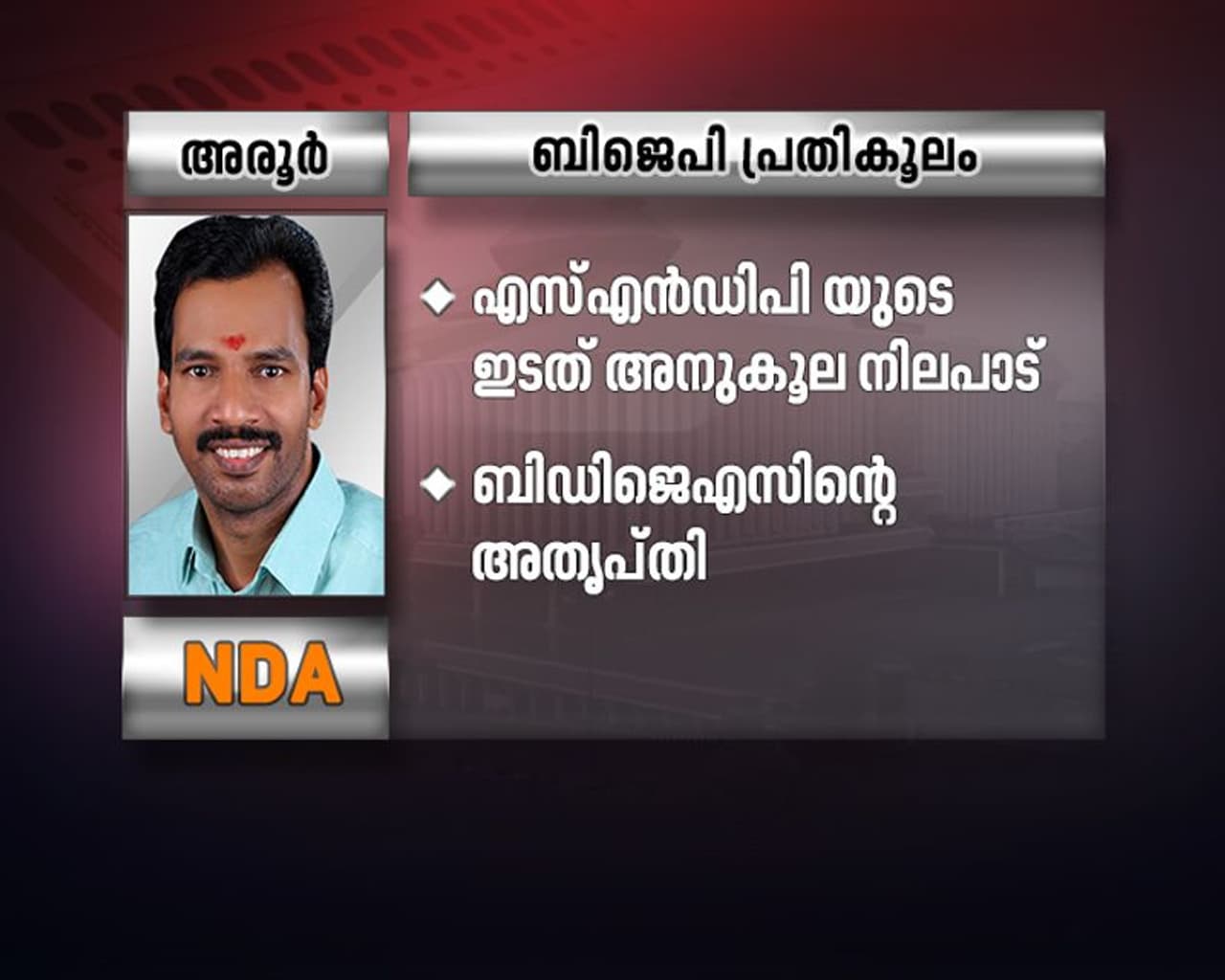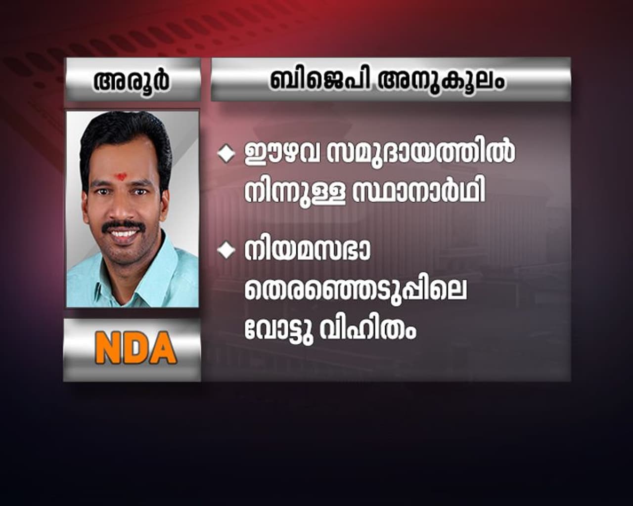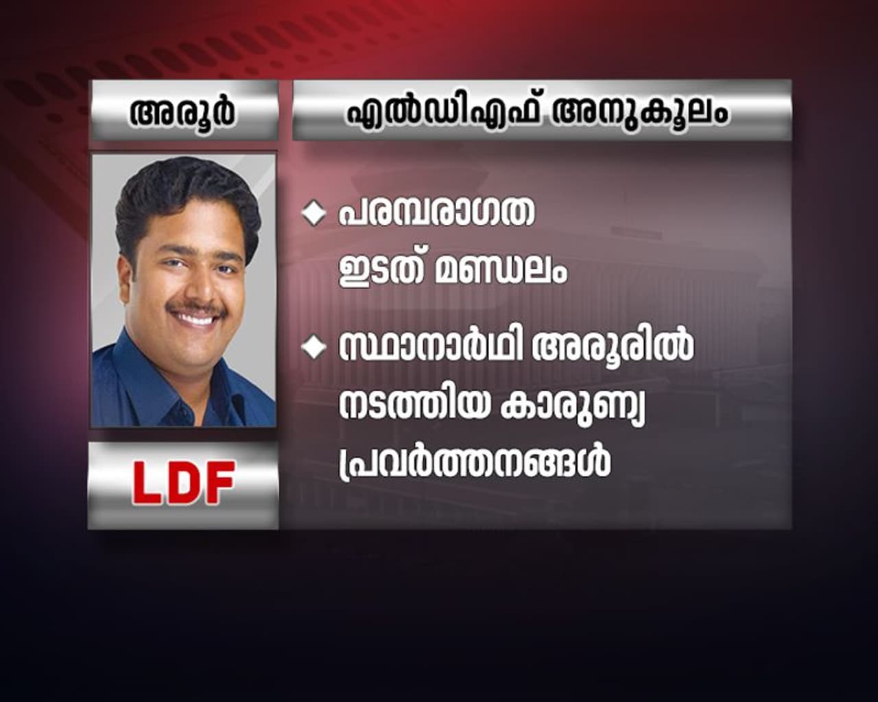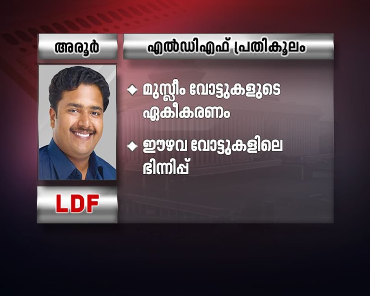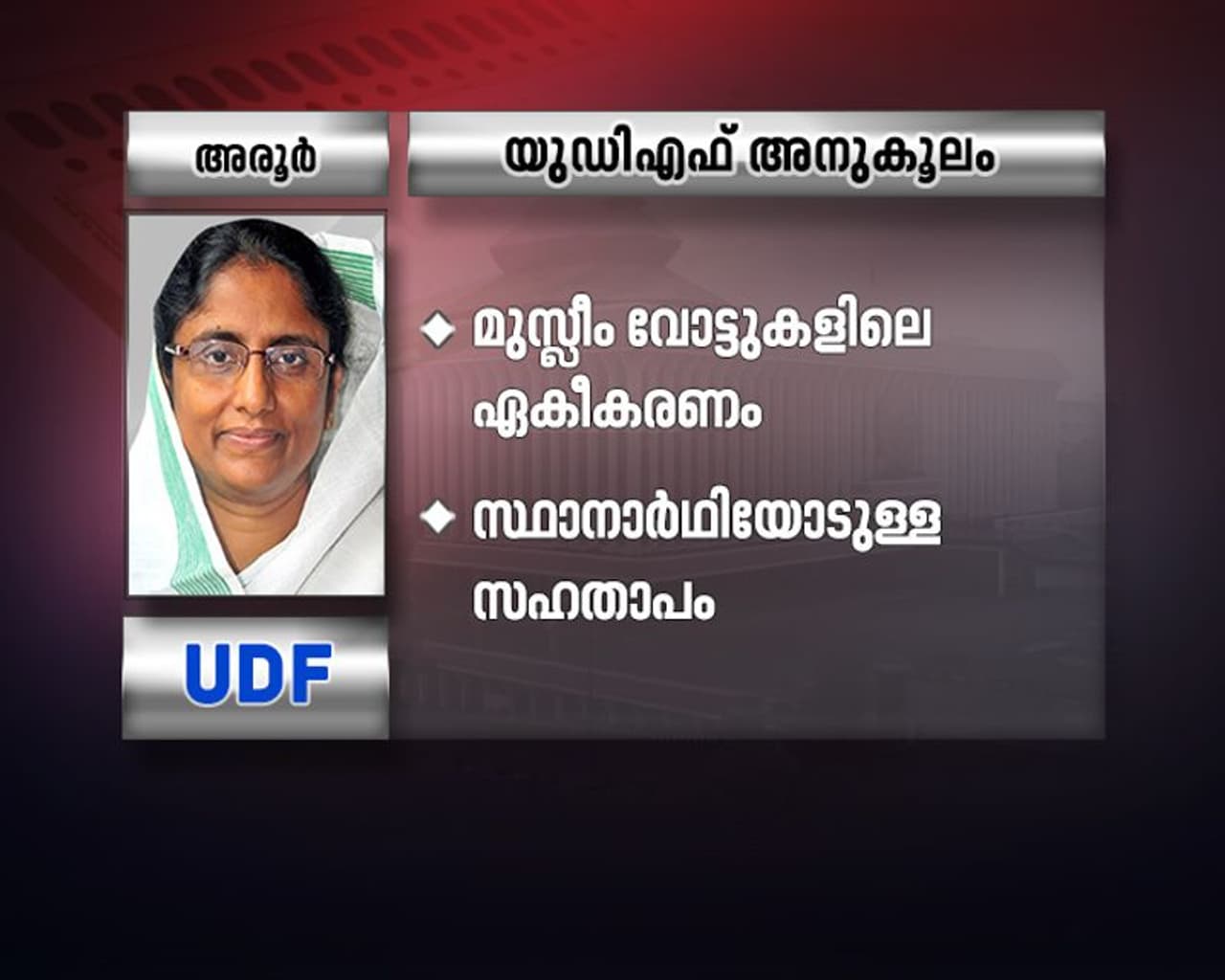 നിയമസഭാ തെരഞ്ഞെടുപ്പുകളിലൊക്കെ എല്ഡിഎഫിനെ വലിയ രീതിയില് തുണച്ചിട്ടുള്ള മണ്ഡലമാണ് അരൂര്. എന്നാല് ലോക്സഭാ തെരഞ്ഞെടുപ്പുകളില് യുഡിഎഫിന് അനുകൂലമായ തരംഗം ഉണ്ടായിട്ടുണ്ട് ഇവിടെ. അതുകൊണ്ട് തന്നെ ഇത്തവണ അരൂര് ആര്ക്ക് അനുകൂലമായാണ് വിധിയെഴുതുക എന്ന് കണ്ടുതന്നെ അറിയണം. തങ്ങളുടെ കോട്ടയായ അരൂരില് ഈഴവവോട്ടുകള് അനുകൂലമാകുമെന്ന കണക്കുകൂട്ടലിലാണ് സിപിഎം. കൂടാതെ ക്രിസ്ത്യൻ വോട്ടുകൾ ലഭിക്കുമെന്നും സിപിഎം പ്രതീക്ഷിക്കുന്നു. എന്നാല് ലോക്സഭയിലെ അനുകൂലതരംഗം തുടരുമെന്ന പ്രതീക്ഷയിലാണ് കോണ്ഗ്രസ്. മുസ്ലീം വോട്ടുകളിലെ ഏകീകരണവും ധീവരരിലെ ഒരു വിഭാഗത്തിന്റെ വോട്ട് ഏകീകകരണവും യുഡിഎഫിന് പ്രതീക്ഷയേകുന്നു.