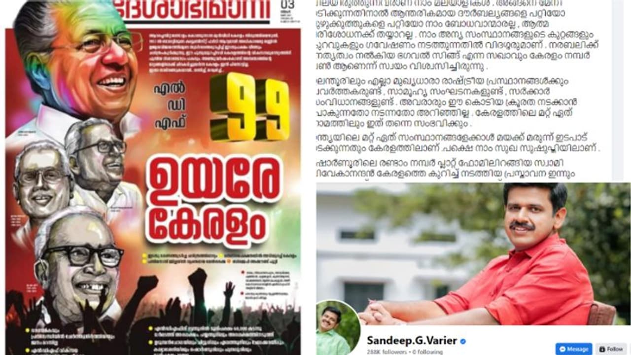പാലക്കാട്: ബിജെപി സംസ്ഥാന വക്താവ് സ്ഥാനത്തു നിന്നും പുറത്താക്കപ്പെട്ടെങ്കിലും സന്ദീപ് വാര്യര് മൗനം ഭജിക്കാനില്ല. കേരളത്തെ നടുക്കിയ ഇലന്തൂര് ഇരട്ട നരഹത്യയില് ഇടതു സര്ക്കാരിനെ പരോക്ഷമായി വിമര്ശിച്ച് സന്ദീപ് വാര്യര് ഫേസ് ബുക്കില് കുറിപ്പിട്ടു.. നരബലിക്ക് നേതൃത്വം നൽകിയ ഭഗവൽ സിങ്ങ് എന്ന സഖാവും കേരളം നമ്പർ വൺ ആണെന്ന് സ്വയം വിശ്വസിച്ചിരുന്നു .ഇന്ത്യയിലെ മറ്റ് ഏത് സംസ്ഥാനങ്ങളേക്കാൾ മയക്ക് മരുന്ന് ഇടപാട് നടക്കുന്നതും കേരളത്തിലാണ് .പക്ഷെ നാം സുഖ സുഷുപ്തിയിലാണ് .ഫേസ് ബുക്ക് പോസ്ററിന്റെ പൂര്ണരൂപം
