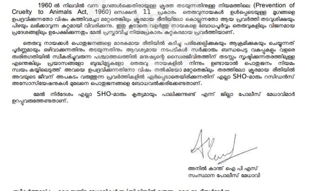 തെരുവുനായകളെ കൊല്ലുന്നത് തടവുംപിഴയും ലഭിക്കാവുന്നകുറ്റമെന്നും ഡിജിപി അനില്കാന്ത്. ഹൈക്കോടതി നിര്ദ്ദേശപ്രകാരം സര്ക്കുലര് പുറത്തിറക്കി.