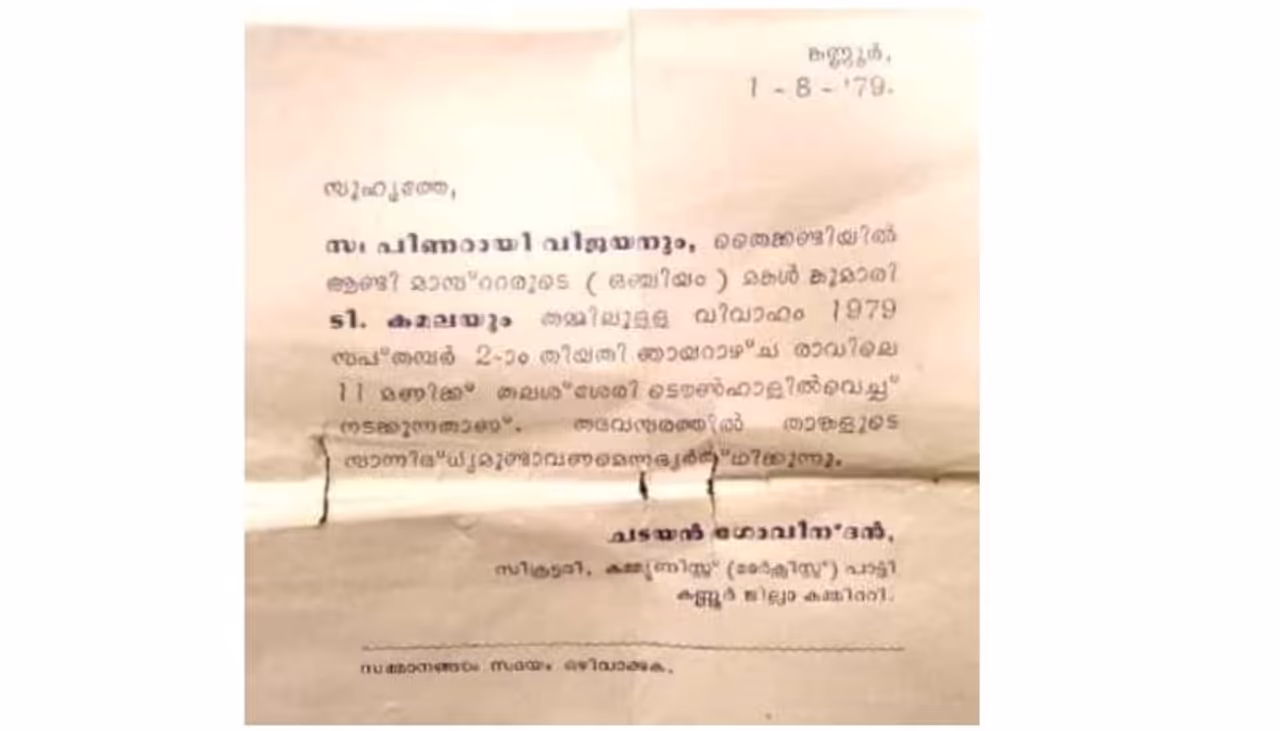 'സുഹൃത്തേ, സ: പിണറായി വിജയനും തൈക്കണ്ടിയിൽ ആണ്ടി മാസ്റ്ററുടെ (ഒഞ്ചിയം) മകൾ കുമാരി ടി. കമലയും തമ്മിലുള്ള വിവാഹം 1979 സെപ്റ്റംബർ രണ്ടാം തീയതി ഞായറാഴ്ച രാവിലെ 11 മണിക്ക് തലശ്ശേരി ടൗൺഹാളിൽ വെച്ച് നടത്തുന്നതാണ്. തദവസരത്തിൽ താങ്കളുടെ സാന്നിദ്ധ്യമുണ്ടാകണമെന്ന് അഭ്യർത്ഥിക്കുന്നു. ചടയൻ ഗോവിന്ദൻ, സെക്രട്ടറി, കമ്യൂണിസ്റ്റ് (മാർക്സിസ്റ്റ്) പാർട്ടി, കണ്ണൂർ ജില്ലാ കമ്മറ്റി. മുഖ്യമന്ത്രിയുടെ വിവാഹക്ഷണക്കത്തിന്റെ ഉള്ളടക്കം.ഇപ്രകാരമായിരുന്നു. സമ്മാനങ്ങൾ സദയം ഒഴിവാക്കുക'- എന്നായിരുന്നു ക്ഷണപത്രത്തിലെ ഉള്ളടക്കം.