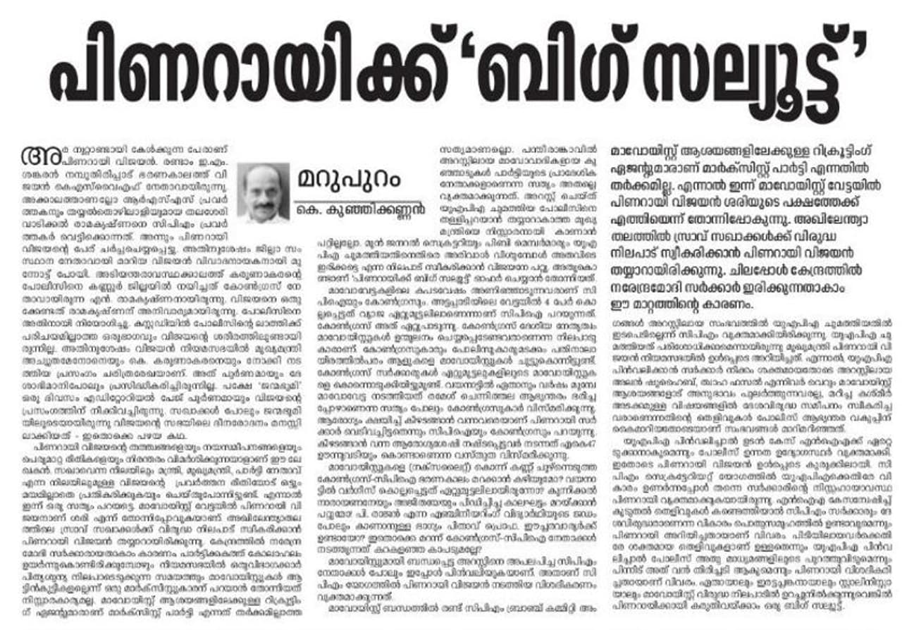 'ഇരട്ടച്ചങ്കനായാലും സ്റ്റാലിനിസ്റ്റായാലും മാവോയിസ്റ്റ് വിരുദ്ധ നിലപാടില് ഉറച്ചുനില്ക്കുന്നുവെങ്കില് പിണറായിക്കായി കരുതിവെയ്ക്കാം ഒരു ബിഗ് സല്യൂട്ട് എന്ന വാചകത്തിലാണ് ലേഖനം അവസാനിപ്പിക്കുന്നത്.