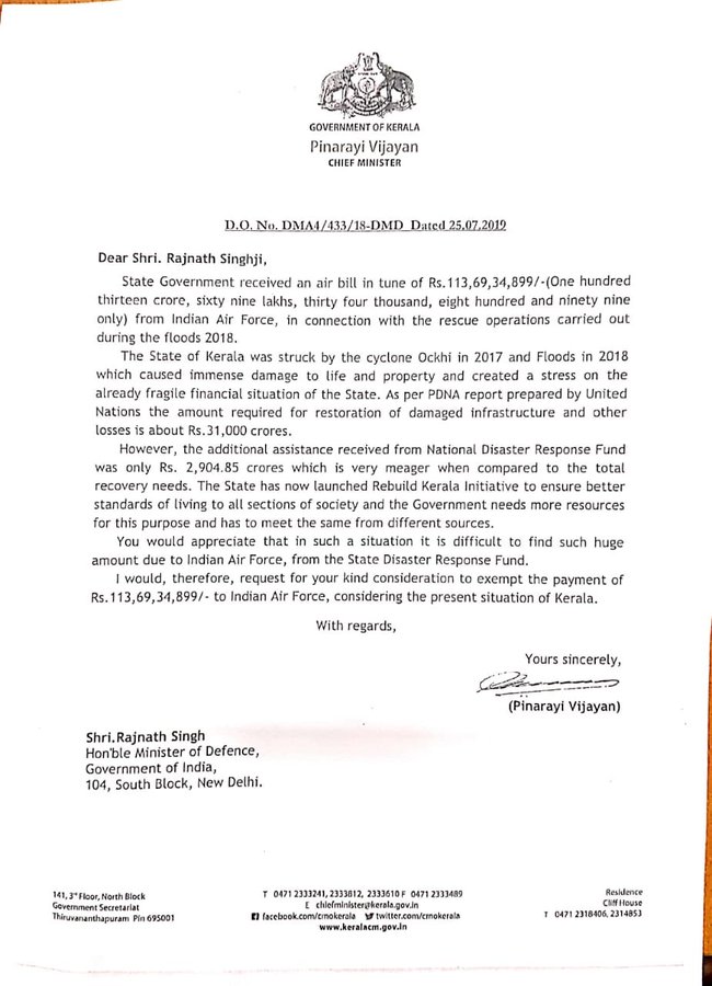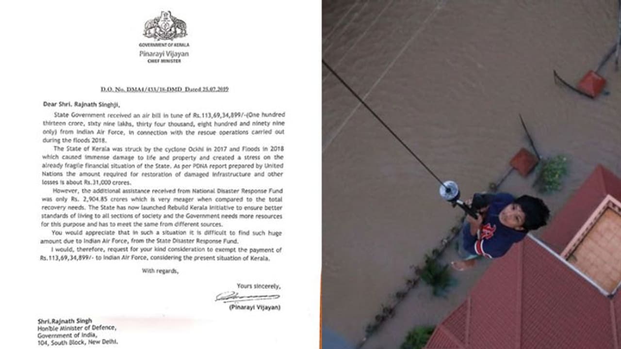 വിമാനങ്ങളും ഹെലികോപ്റ്ററുകളും ഉപയോഗിച്ചുള്ള രക്ഷാപ്രവര്ത്തനത്തിന് ഇത്രയും തുക ചെലവായതായി വ്യോമസേന പറയുന്നു. എന്നാല് ഈ തുക അടക്കുന്നതില് നിന്ന് ഒഴിവാക്കിത്തരണമെന്നാവശ്യപ്പെട്ട് മുഖ്യമന്ത്രി പിണറായി വിജയന് കേന്ദ്ര പ്രതിരോധ മന്ത്രി രാജ്നാഥ് സിങ്ങിന് കത്തയച്ചു.