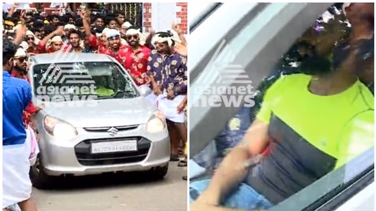 കാറിന് ചുറ്റും നിന്ന് ആരവങ്ങളുയര്ത്തി സഹപാഠികള് അഖിലിനെ എതിരേറ്റു. സഹപാഠികള് നടത്തിയ ഘോഷയാത്രയില് കാറിലിരുന്ന് പങ്കെടുത്തതിന് ശേഷമാണ് അഖില് കോളേജിലേക്ക് കയറിയത്. ഓണാഘോഷ പരിപാടിയുടെ ഉദ്ഘാടന വേദിയിലേക്ക് വിദ്യാര്ത്ഥികള് അഖിലിനെ ക്ഷണിച്ചിരുത്തുകയായിരുന്നു.