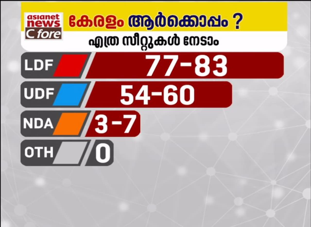ഇനി, ഫലമെന്താകുമെന്ന് പരിശോധിച്ചാൽ എൽഡിഎഫ് 77 മുതൽ 83 സീറ്റ് വരെ നേടാമെന്ന് സർവേ പ്രവചിക്കുന്നു. യുഡിഎഫ് 54 മുതൽ 60 സീറ്റ് വരെ നേടാം. എൻഡിഎ 3 മുതൽ 7 സീറ്റ് വരെ നേടാം എന്നും സർവേ പ്രവചിക്കുന്നുണ്ട്.