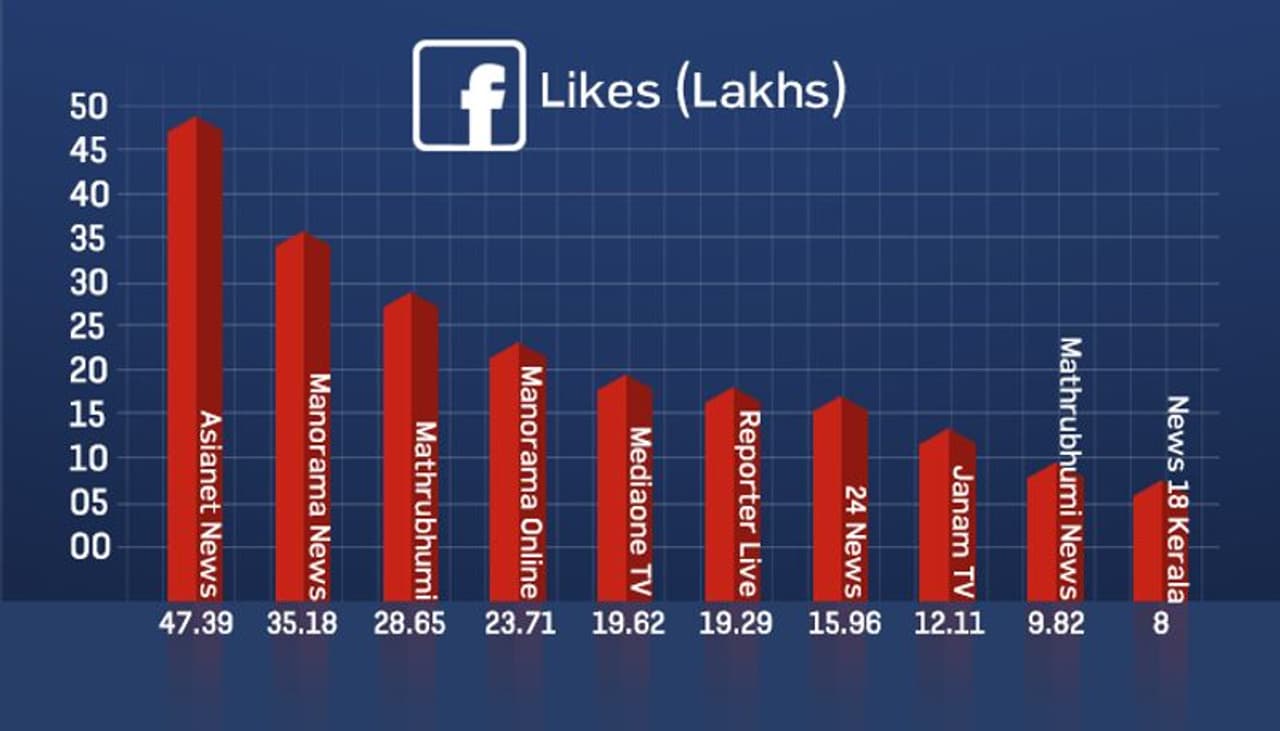 വാര്ത്തകളറിയാന് സോഷ്യല് മീഡിയ ഉപയോക്താക്കള് ഏറ്റവുമധികം ആശ്രയിക്കുന്ന മലയാള മാധ്യമവും ഏഷ്യാനെറ്റ് ന്യൂസ് തന്നെ. ഫേസ്ബുക്കില് ഏഷ്യാനെറ്റ് ന്യൂസിന്റെ പേജിന് 47.39 ലക്ഷം ലൈക്കുകളാണ് ഉള്ളത്. 35.18 ലക്ഷം ലൈക്കുകളുമായി മനോരമ ന്യൂസ് രണ്ടാം സ്ഥാനത്തും 28.65 ലക്ഷം ലൈക്കുകളുമായി മാതൃഭൂമി മൂന്നാമതുമാണ്.