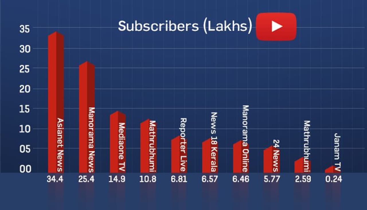 യൂട്യൂബില് ഏഷ്യാനെറ്റ് ന്യൂസ് ചാനല് സബ്സ്ക്രൈബ് ചെയ്തിട്ടുള്ളത് 34.4 ലക്ഷം പ്രേക്ഷകരാണ്. മനോരമ ന്യൂസിന് 25.4 ലക്ഷം സബ്സ്ക്രൈബേഴ്സുള്ളപ്പോള് മൂന്നാമതുള്ള മീഡിയവണ് ടിവിക്ക് 14.9 ലക്ഷം പ്രേക്ഷകരുണ്ട്.