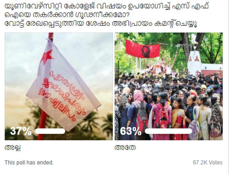 ഫേസ്ബുക്കിലൂടെ നടത്തിയ സര്വേയില് പങ്കെടുത്തവരില് 63 ശതമാനം പേരും എസ്എഫ്ഐയെ തകര്ക്കാന് നീക്കം നടക്കുന്നതായാണ് വോട്ട് ചെയ്തത്