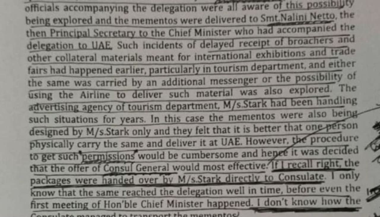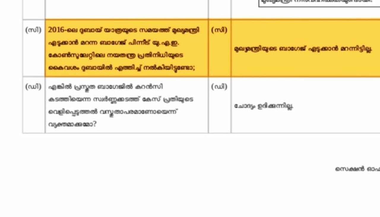 2016ൽ യുഎഇ സന്ദർശനത്തിനിടെ ബാഗേജ് മറന്നിട്ടില്ല എന്ന് നിയമസഭയെ രേഖാമൂലം അറിയിച്ച് മുഖ്യമന്ത്രി, ആറന്മുള കണ്ണാടി അടക്കമുള്ള ഉപഹാരങ്ങൾ അടങ്ങിയ ബാഗ് പിന്നീട് എത്തിച്ചെന്ന് എം.ശിവശങ്കറിന്റെ മൊഴി
