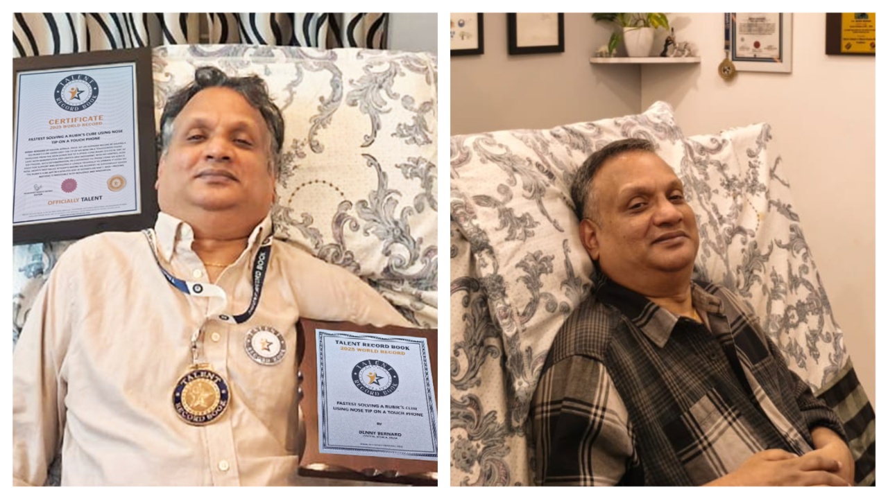 23ാ- മത്തെ വയസ്സിൽ ഒരു ആക്സിഡന്റിന്റെ രൂപത്തിലെത്തി വീഴ്ത്തിക്കളഞ്ഞ വിധിയോട് ബെന്നി ബെർണാഡിന് പരിഭവമോ പരാതിയോ ഇല്ല. മറിച്ച് ഇക്കാലമത്രയും ആത്മധൈര്യം കൊണ്ടും ഇച്ഛാശക്തി കൊണ്ടും പ്രതിസന്ധികളെ മറികടന്ന കഥയാണ് ബെന്നിക്ക് പറയാനുള്ളത്. അസാധ്യം എന്ന വാക്കിന്റെ മുന്നിൽ പകച്ചുനിൽക്കാതെ പുതിയൊരു നേട്ടത്തെ എത്തിപ്പിടിച്ചിരിക്കുകയാണ് എറണാകുളം ജില്ലയിലെ ഫോർട്ട് കൊച്ചി നസ്രേത്ത് സ്വദേശിയായ ബെന്നി ബെർണാഡ്. സ്മാർട്ട് ഫോണിൽ മൂക്ക് കൊണ്ട് റുബിക്സ് ക്യൂബ് സോൾവ് ചെയ്ത് ടാലന്റ് റെക്കോർഡ് ബുക്ക് അംഗീകാരം നേടിയിരിക്കുകയാണ് ബെന്നി.