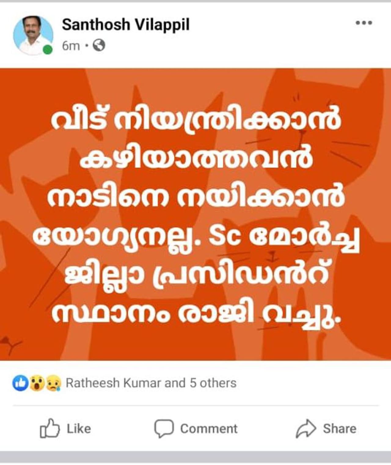 സന്തോഷിന്റെ വീടിന്റെ രണ്ടാം നിലയിലെ ഒറ്റമുറിയിലാണ് രഞ്ജിത്ത് കുടുംബത്തോടൊപ്പം താമസിച്ചിരുന്നത്. ടെറസിലെ പച്ചക്കറി കൃഷിക്കിടെ സന്തോഷ് കഞ്ചാവ് ചെടികളും വളർത്തുകയായിരുന്നു. പൊലീസിന് കിട്ടിയ രഹസ്യവിവരത്തെത്തുടർന്നായിരുന്നു പരിശോധന. മരുമകനെ പൊലീസ് അറസ്റ്റ് ചെയ്തതിന് പിന്നാലെ സന്തോഷ് ഫേസ്ബുക്കിലാണ് രാജിക്കാര്യം പങ്കുവെച്ചത്. 'വീട് നിയന്ത്രിക്കാൻ കഴിയാത്തവൻ നാടിനെ നയിക്കാൻ യോഗ്യനല്ലെന്നും അതില് എസ്സി മോർച്ച ജില്ലാ പ്രസിഡന്റ് സ്ഥാനം രാജിവെച്ചു' എന്നായിരുന്നു സന്തോഷിന്റെ ഫേസ്ബുക്ക് പോസ്റ്റ്.