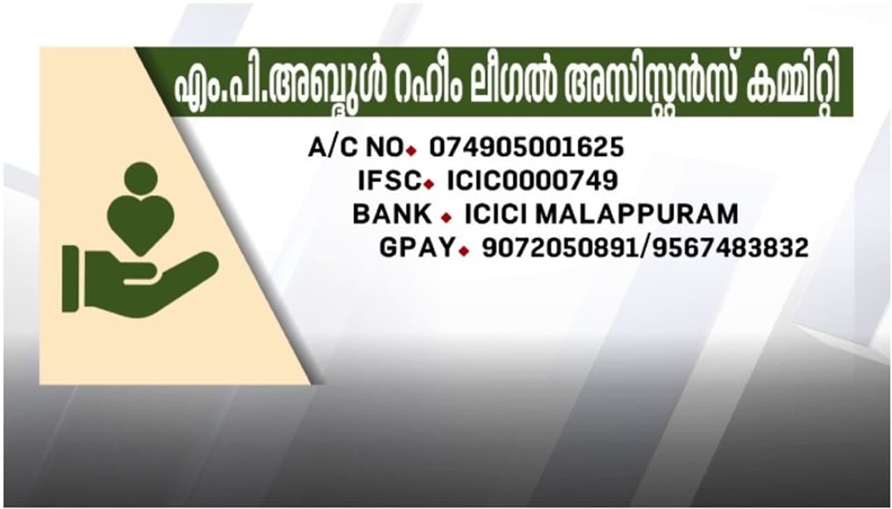 ബോബി ചെമ്മണ്ണൂരിന്റെ സോഷ്യല് മീഡീയാ അക്കൗണ്ട് വഴിയും പണം സ്വരൂപിക്കും.അബ്ദുല് റഹീം ലീഗൽ അസിസ്റ്റൻസ് കമ്മിറ്റി ട്രസ്റ്റിന്റെ അക്കൗണ്ടിലാണ് പണം സ്വരൂപിക്കുന്നത്. ശിക്ഷ നടപ്പാക്കുന്നതിൽ സാവകാശം തേടി കേന്ദ്ര വിദേശകാര്യമന്ത്രാലയം വഴി അപേക്ഷയും സമര്പ്പിച്ചിട്ടുണ്ട്.