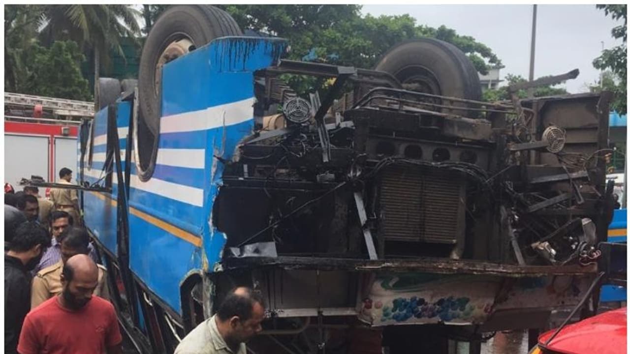 മെഡിക്കല് കോളേജ് ഭാഗത്തുനിന്ന് ടൗണിലേക്ക് വരികയായിരുന്ന ദീര്ഘദൂര ബസാണ് അപടത്തില്പ്പെട്ടത്. അമിതവേഗതയാണ് അപകടകാരണമന്നാണ് നാട്ടുകാര് ആരോപിക്കുന്നത്