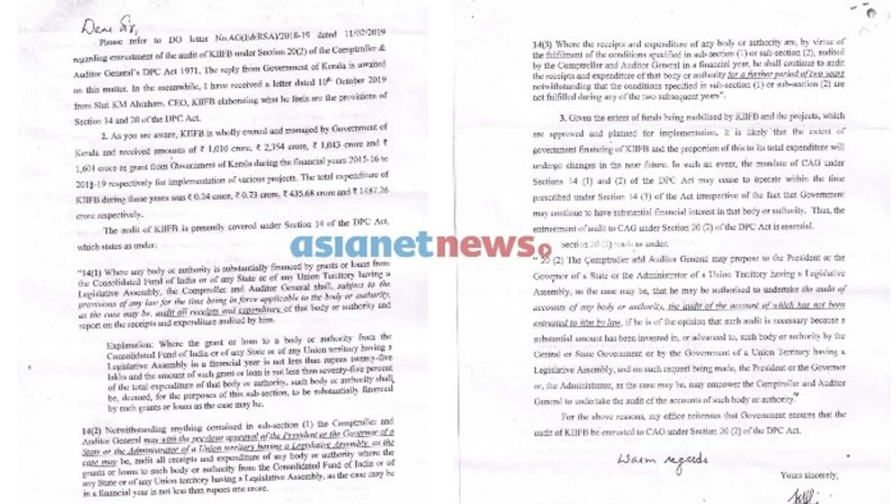19 ദിവസം മുമ്പ് ഒക്ടോബർ 24 ന് ചീഫ് സെക്രട്ടറിക്കാണ് എജി കത്ത് നല്കിയത്. കിഫ്ബി ഓഡിറ്റിനായി ഫെബ്രുവരി പതിനൊന്നിന് ചീഫ്സെക്രട്ടറിക്കയച്ച കത്തിന് ഇതു വരെ മറുപടി കിട്ടിയിട്ടില്ലെന്നും എജി ചൂണ്ടിക്കാണിക്കുന്നു. സെക്ഷൻ 14 അനുസരിച്ചുള്ള ഓഡിറ്റ് മതിയെന്ന്, സർക്കാർ നിയമസഭയ്ക്കകത്തും പുറത്തും നടത്തുന്ന വാദങ്ങൾ പൊളിക്കുന്നതാണ് സിഎജി യുടെ പുതിയ കത്ത്.