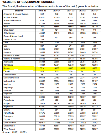 രാജ്യത്താകെ സർക്കാർ സ്കൂളുകൾ അടച്ചുപൂട്ടുന്നത് ശ്രദ്ധയിൽപെട്ടിട്ടുണ്ടോയെന്നും സംസ്ഥാനം തിരിച്ച് അടച്ചുപൂട്ടിയ സർക്കാർ സ്കൂളുകളുടെ കണക്ക് പറയാമോയെന്നുമായിരുന്നു കെ രാധാകൃഷ്ണൻ എംപിയുടെ ചോദ്യം. കേന്ദ്ര ഭരണ പ്രദേശങ്ങളിലെയും സംസ്ഥാനങ്ങളിലെയും കഴിഞ്ഞ അഞ്ച് വർഷത്തെ (2019-20 മുതൽ 2023-24 വരെ) സർക്കാർ സ്കൂളുകളുടെ എണ്ണമാണ് കേന്ദ്രസർക്കാർ നൽകിയ പട്ടികയിലുള്ളത്. പട്ടിക താഴെ.