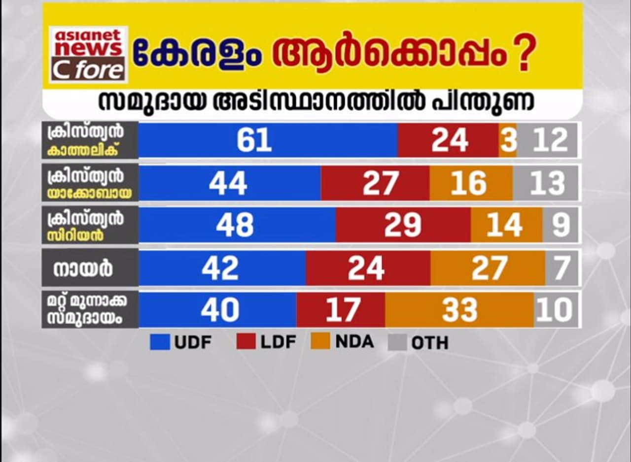 ക്രിസ്ത്യൻ^കാത്തലിക് വിഭാഗത്തിന്റെ വോട്ടകണക്കിൽ എൽഡിഎഫ് 24 യുഡിഎഫ് 61, എൻഡിഎ 3 മറ്റുള്ളവര് 12 എന്നിങ്ങനെയായിരിക്കും വോട്ട് വിഹിതമെന്നാണ് സര്വെ പറയുന്നത്. ക്രിസ്ത്യൻ^സിറിയൻ വിഭാഗത്തിലേക്ക് വന്നാൽ ഇടത് മുന്നണി 29 . യുഡിഎഫ് 48 ,എൻഡിഎ 14 മറ്റുള്ളവര് 9 എന്നിങ്ങനെയാണ് സര്വെ ഫലം.