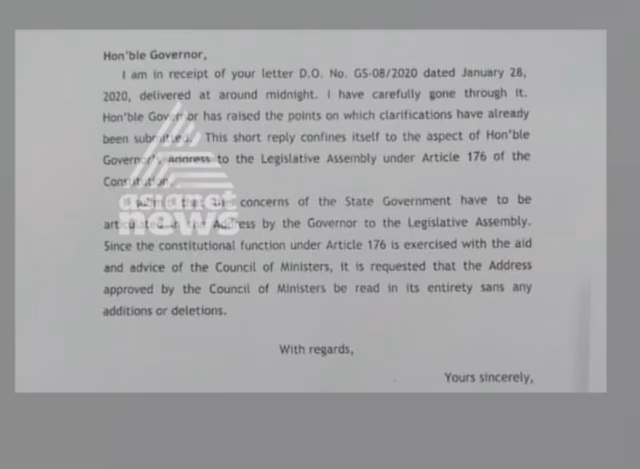 എന്തുകൊണ്ടാണ് പൗരത്വ നിയമഭേദഗതിക്ക് എതിരായ പരാമർശം നയപ്രഖ്യാപന പ്രസംഗത്തിൽ ഉൾപ്പെടുത്തിയത് എന്നതിൽ വിശദീകരണം തേടിക്കൊണ്ടുള്ള താങ്കളുടെ കത്ത് അർദ്ധരാത്രിയോടെ കിട്ടി. വിശദമായി, സൂക്ഷ്മമായിത്തന്നെ അത് ഞാൻ വായിച്ചു. ബഹുമാനപ്പെട്ട ഗവർണർ ചൂണ്ടിക്കാട്ടിയ വിഷയങ്ങളിൽ പലതിനും കൃത്യമായ വിശദീകരണം ഞങ്ങൾ നൽകിയതാണ്. ഈ ചെറുമറുപടി ഇപ്പോൾ നൽകുന്നത്, താങ്കൾ നടത്താനിരിക്കുന്ന നയപ്രഖ്യാപനപ്രസംഗത്തിന്റെ അടിസ്ഥാനത്തിലാണ്.