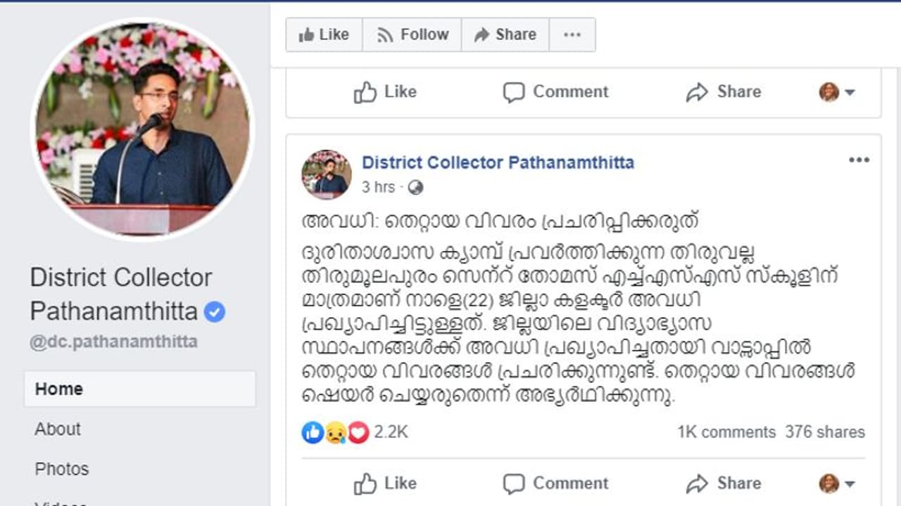 ജില്ലയിലെ വിദ്യാഭ്യാസ സ്ഥാപനങ്ങൾക്ക് അവധി പ്രഖ്യാപിച്ചതായി വാട്സാപ്പിൽ തെറ്റായ വിവരങ്ങൾ പ്രചരിക്കുന്നുണ്ട്. തെറ്റായ വിവരങ്ങൾ ഷെയർ ചെയ്യരുതെന്ന് അഭ്യർഥിക്കുന്നുവെന്ന് പത്തനംത്തിട്ട ജില്ലാ കളക്ടര്ക്ക് പോസ്റ്റ് ഇടേണ്ട അവസ്ഥ വരെ കാര്യങ്ങള് എത്തി നില്ക്കുന്നു.