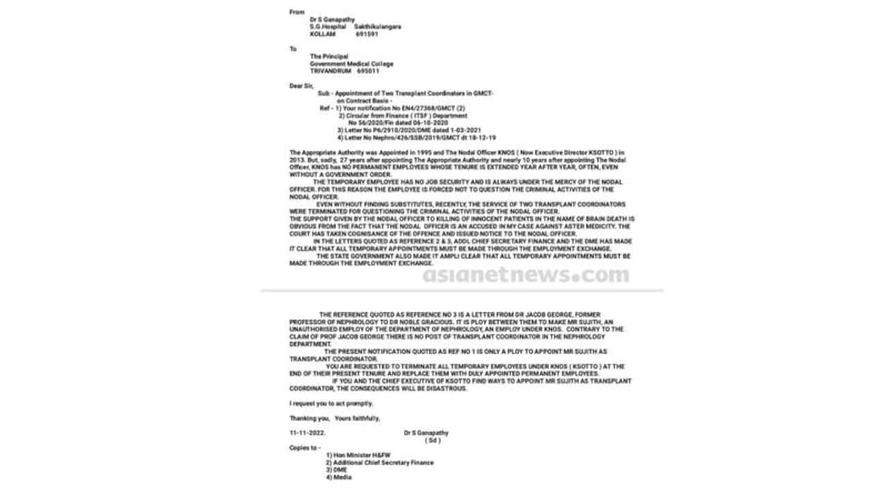 തിരുവനന്തപുരം മെഡിക്കൽ കോളേജ് പ്രിൻസിപ്പൽ 29 സെപ്റ്റംബർ 2022 -ൽ പുറത്തിറക്കിയ വിജ്ഞാപനം പ്രകാരം ബി.എസ്.സി/ എം.എസ്.സി നേഴ്സിംഗ് അല്ലെങ്കിൽ സോഷ്യൽ വർക്ക്/ സൈക്കോളജി/ സോഷ്യോളജി/ സോഷ്യൽ സയൻസ്/ പബ്ലിക്ക് ഹെൽത്ത് വിഷയത്തിൽ ബിരുദം ആണ് ട്രാൻസ്പ്ലാന്റ് കോ-ഓർഡിനേറ്റർ തസ്തികയുടെ അടിസ്ഥാന യോഗ്യതയായി പറയുന്നത്. ഇതിന് പുറമെ രണ്ട് വർഷത്തെ പ്രവർത്തി പരിചയവും അംഗീകൃത ഏജൻസിയിൽ നിന്ന് അവയവം മാറ്റിവയ്ക്കല്ലിനെ കുറിച്ചുള്ള പരിശീലനവും യോഗ്യത ആയി പറയുന്നു. ഒരു വർഷത്തേക്ക് ആണ് നിയമനം. 29,535 രൂപയാണ് പ്രതിമാസ ശമ്പളം. ഒക്ടോബർ 19 ആയിരുന്നു ഇതിനായി ഉള്ള അവസാന ദിവസം. ആരോപണം ഉയര്ന്നതോടെ നിലവിലെ വിജ്ഞാപനം റദ്ദ് ചെയ്ത് എംപ്ലോയ്മെന്റ് എക്സ്ചേഞ്ച് വഴി യോഗ്യരായവരെ കണ്ടെത്തി നിയമിക്കണമെന്ന ആവശ്യം ഉയർന്നിട്ടുണ്ട്.