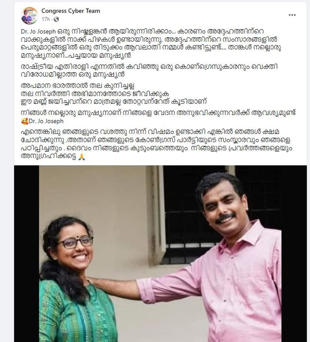 ‘ജോ ജോസഫ് ഒരു നിഷ്കളങ്കന് ആയിരുന്നിരിക്കാം. കാരണം അദ്ദേഹത്തിന്റെ വാക്കുകളില് നാക്ക് പിഴകള് ഉണ്ടായിരുന്നു. അദ്ദേഹത്തിന്റെ സംസാരങ്ങളില് പെരുമാറ്റങ്ങളില് ഒരു തിടുക്കവും ആവലാതിയും നമ്മള് കണ്ടിട്ടുണ്ട്, നിങ്ങളെ വേദന അനുഭവിക്കുന്നവര്ക്ക് ആവശ്യമുണ്ട്. ഞങ്ങളുടെ ഭാഗത്ത് നിന്ന് എന്തെങ്കിലും വിഷമം ഉണ്ടാക്കി എങ്കില് ഞങ്ങള് ക്ഷമ ചോദിക്കുന്നു. അതാണ് ഞങ്ങളുടെ കോണ്ഗ്രസ് പാര്ട്ടിയുടെ സംസ്കാരവും ഞങ്ങളെ പഠിപ്പിച്ചതും. ദൈവം നിങ്ങളുടെ കുടുംബത്തെയും നിങ്ങളുടെ പ്രവര്ത്തങ്ങളെയും അനുഗ്രഹിക്കട്ടെ' എന്നും ഫേസ്ബുക്ക് പോസ്റ്റില് പറയുന്നു.